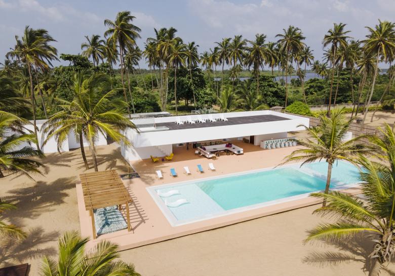This striking, minimal beach pavilion was designed for a young family from Lagos who come to the beach for the day, often hosting celebrations and gatherings around the pool. The space is designed to have a fully indoor/outdoor feel, with the comfort of a living room in a space that is largely open with dramatic views and cooling airflow.