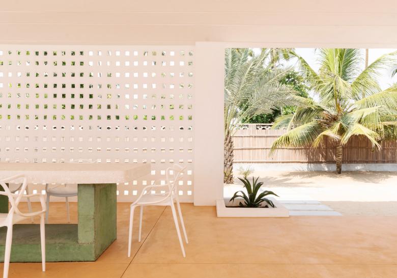 The building is designed to take full advantage of the directional wind and takes into account the equatorial location to build spaces where there are striking geometric lines of shade created by the sun year-round. Colour played an important role in the pavilion, from the calming aqua of the pool to the olive green accents in the furniture. The floating coral-pink pool deck contrasts elegantly against the golden yellow sand of Ilashe beach.