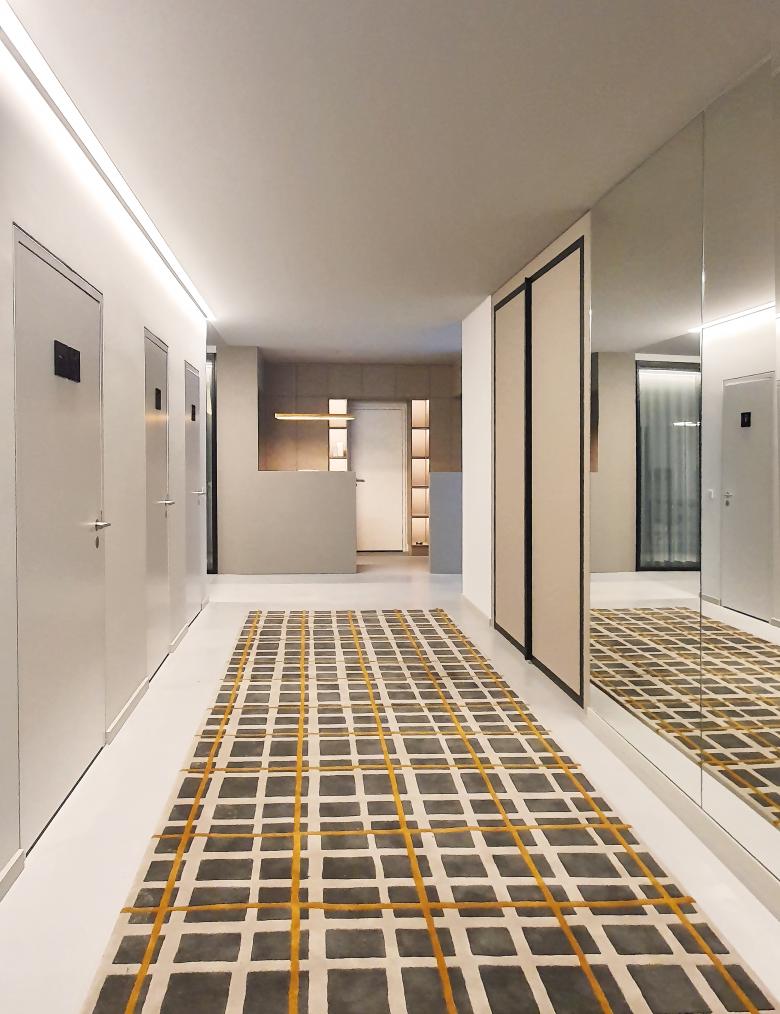 Added to this brief was the need to compensate for the lack of daylight due to the building's layout and location. Located on the ground floor, the centre with reception and hallways doesn't receive any direct daylight. We compensated this by creating a bright space with bright walls. The recessed, frameless light line around the functional core grazes and brightens the walls. The integrated light line frames the space, guides the view towards the reception desk. Furthermore, through combining architectural and emergency lighting in this fixture we could keeps the ceiling free of any additional fixtures. This at the same time, helped us to work around some of the challenges as several walls and ceilings are made with stretched acoustic fabric. Any piercing in this ceiling is challenging and could rip the fabric. To mount the fixtures on this fabric ceiling we had to make wooden sub-constructions allowing us to suspended and recess from this ceiling. We therefore kept the amount of piercings through the fabric surfaces to a minimum.