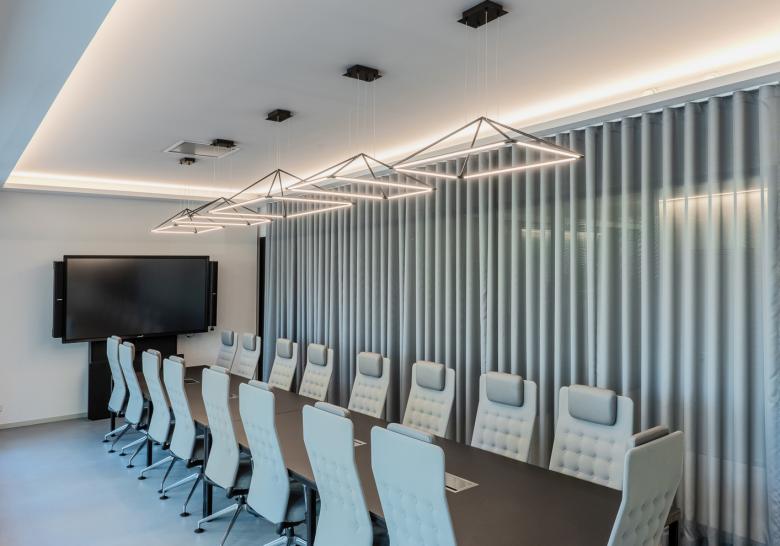 Throughout the project we aimed to have a coherent style of lighting. Lots of integrated elements that become part of the architecture on the one hand, on the other the decorative fixtures are graphical statement pieces. Like for example in the large meeting room. Here the graphical pendants are like sculptures and the cove lighting is part of the architecture. The indirect, dynamic white lighting (2200K - 4000K) creates glare-free lighting for video conferences and/or a warm and inviting setting when hosting an event.