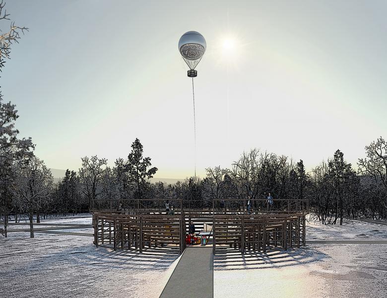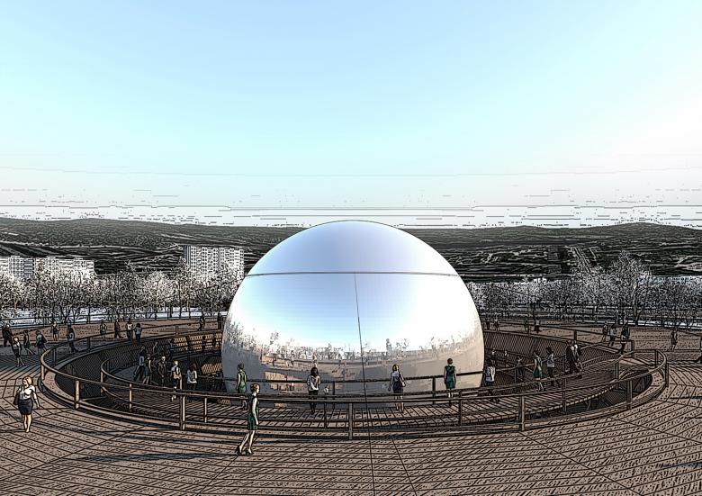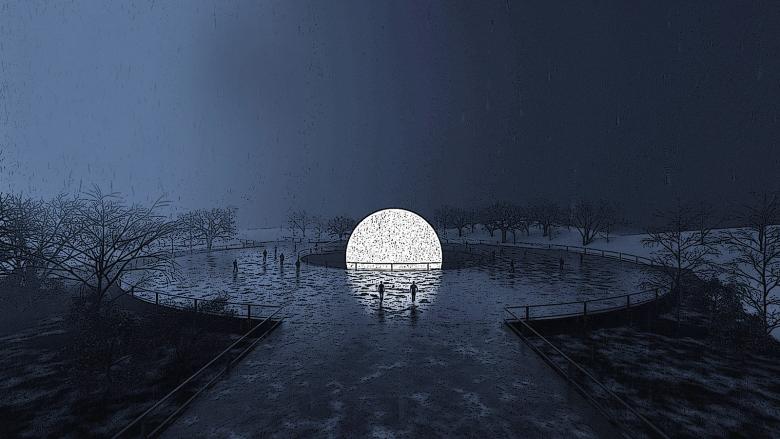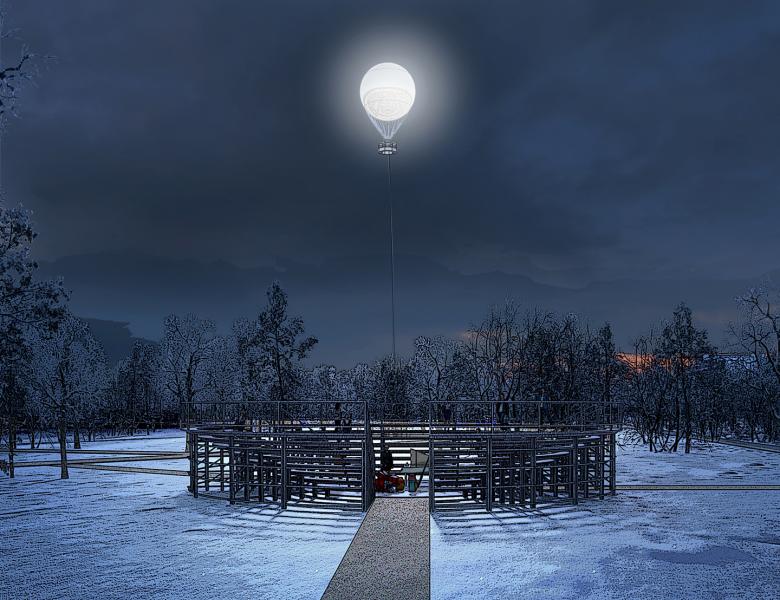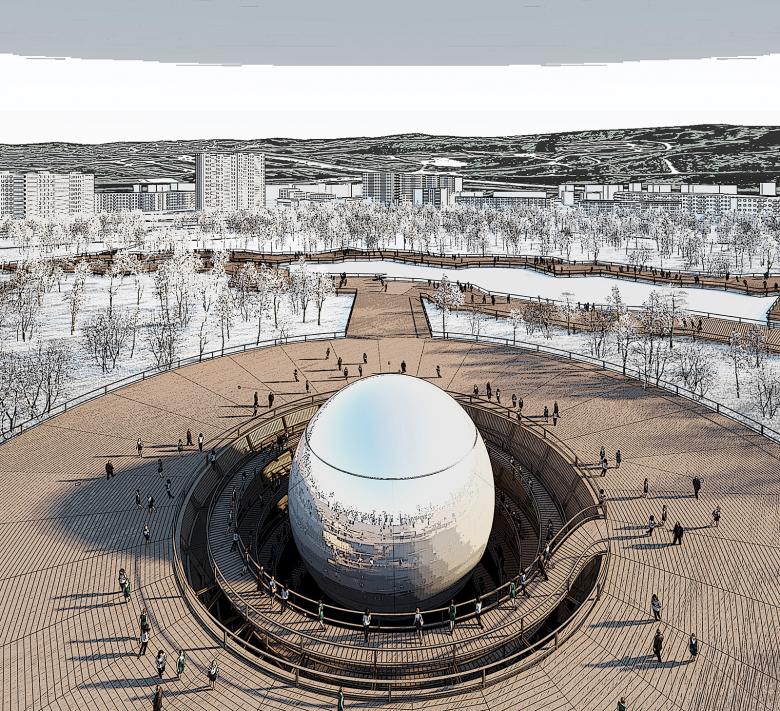 Reacting to climatic conditions, The Murmansk moon will rise high up in the sky or disappear deep into the ground. During daytime, it will shine like a bright star, reflecting the sunlight and its surroundings. In the dark, it will shine like a full moon, lighting up the park and the landscape beyond. The visible appearance and disappearance of our moon will also connect and give the park a deserved visibility in a redefined skyline of Murmansk.