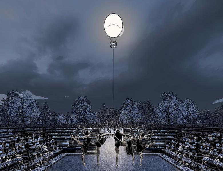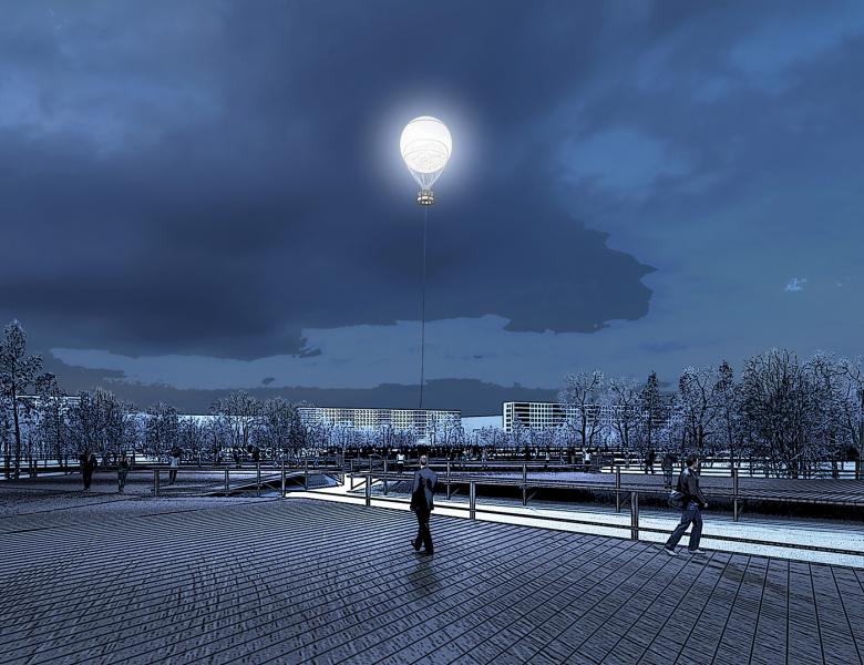 5. The reflective Moon: Is a 25 meter diameter helium balloon to which a micro perforated reflective p.v.c membrane is applied. During daytime, the membrane reflects the surroundings (inside the crater at rest, or the surrounding landscape in altitude) At night, the balloon, which houses a powerful light source in its center, becomes an artificial moon that can be seen from far, bringing light to the park and the surroundings.