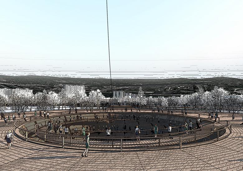 6. The Promenade theater is a 22500 square meter zigzagging plateau. Which is connected to existing paths within and around the park. At its center, it frames the Varnichnoe lake, and acts as a platform / base to the crater as well as other more conventional outdoor performance stages. The lightweight nature of its structure, its slight elevation from the ground and its construction materials will preserve the organic connections and the relationship between the existing body of water and its natural surroundings.