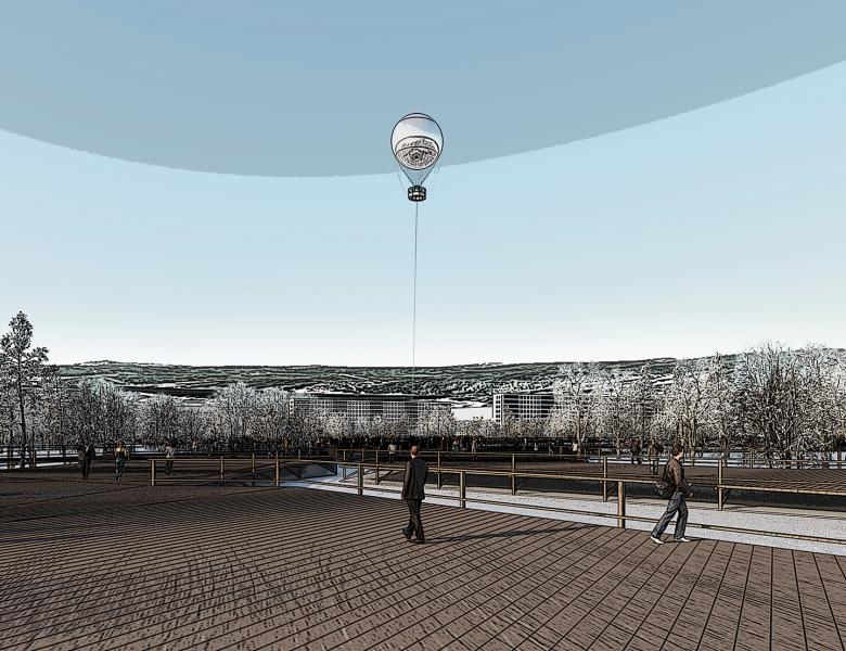 4. The Crater: Is the landing and anchoring site of a 25 m diameter helium balloon. The Balloon has a circular gondola attached to it, which can carry up to 15 people. When ambient wind speed is under 25 km/h, the balloon can rise up to 200 m, taking its passengers for an exceptional ride in the altitudes .At rest, the gondola is parked at the bottom of the crater and a 6 m diameter circular stage is placed in the gondola, turning the Crater into an experimental performance space. Depending on weather conditions, the crater can serve indoor or outdoor performances. The audience as well as the performers can conquer the 450 m long ramp that starts at deck level and twirls down 25 meters below ground.
