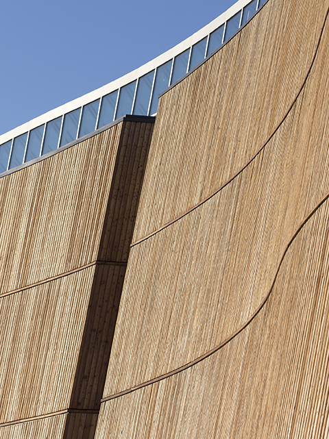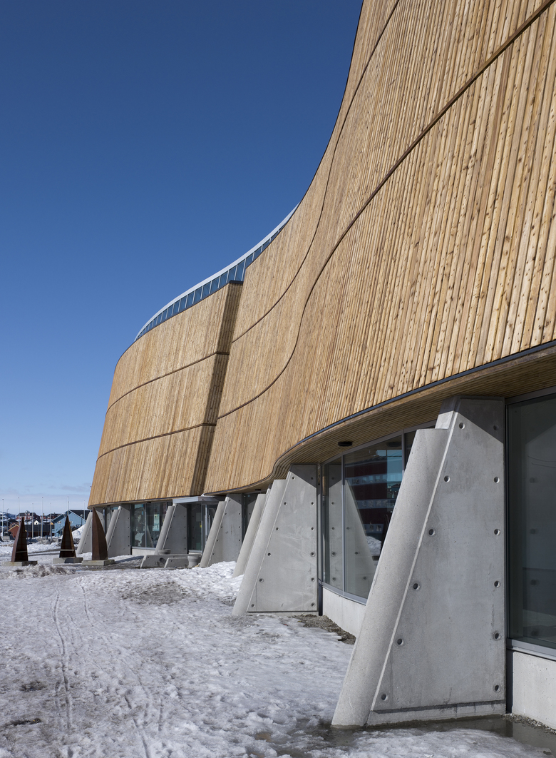Inspired by Greenland’s dramatic scenery of icebergs, snowfields and mountains, the main element of the building is sheathed by a floating, undulating screen of golden larch wood. This second skin lends the scheme an elegant airiness, creating a contrast with the solid form of the core building. The screen acts as an architectural metaphor for the Northern Lights, whereas the dark and massive form of the main building is reminiscent of the icy mountains of Greenland.