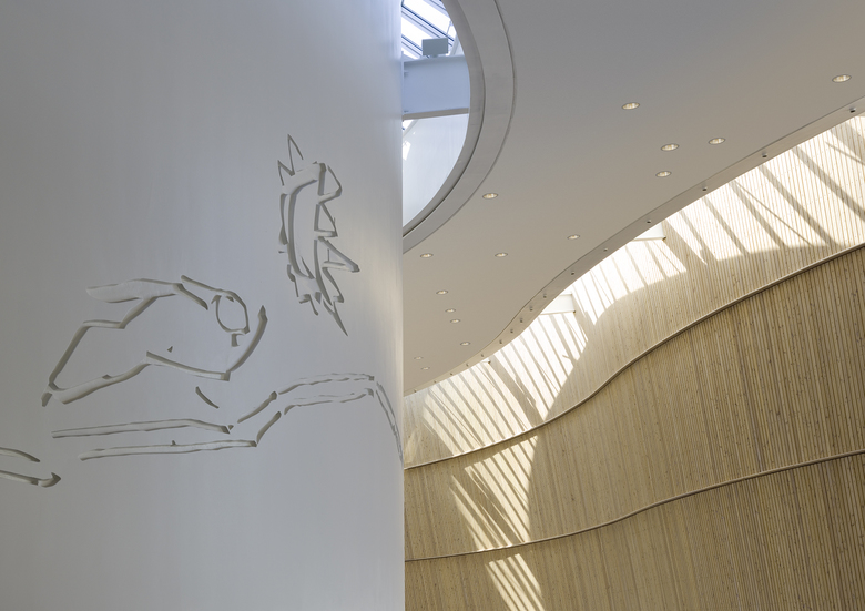 Daylight streams into the large foyer through roof lights and narrow oblong glass slits in the external screen. The foyer serves as an indoor public piazza for the city and is divided into separate areas by three free-standing geometric structures housing the main facilities of the Cultural Centre: a square box for the television studio, a triangular structure for the café and a circular form for the multi-purpose auditorium which has seating for 550 people and can also be used as a cinema or a concert or conference hall. The Cultural Centre of Greenland in Nuuk is a dynamic meeting place for Inuits from all over the northern hemisphere.
