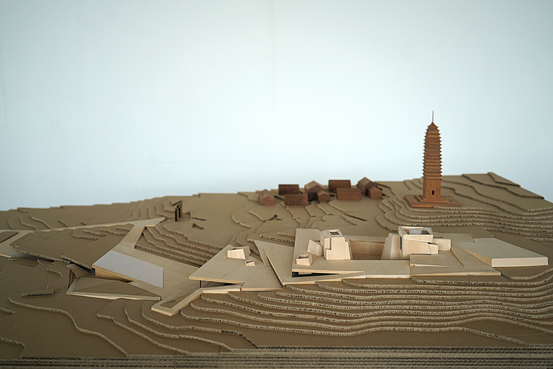 Although the 9thC and 10thC Three Pagodas located north of Dali are famous, the Hongsheng Temple Pagoda dating from the same period and just to the south of the city is relatively unknown. Next to this Buddhist pagoda is the abandoned TaoistLaojun Temple from the Qing Dynasty,with the majestic Cang mountain range in the background. Studio Zhu-Pei received the commission for a Museum of Contemporary Art on the grounds of the Hongsheng Temple Pagoda and the Laojun Temple, after the client had learned about the design for the Yang Liping performing Arts in Dali.