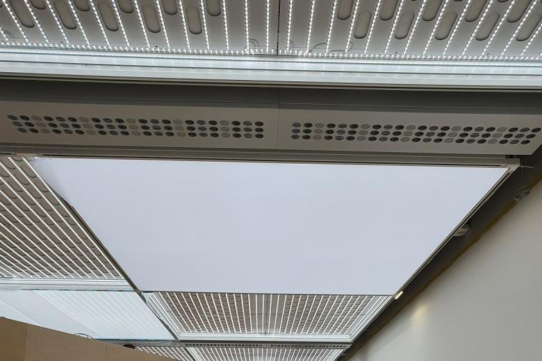 Die Raumluftströmung wurde bereits in einer frühen Planungsphase durch eine externe Strömungsuntersuchung bestätigt und abgesichert. Um sicherzugehen, dass alle gebäudetechnischen Herausforderungen erfüllt und störende Einflüsse bewertet bzw. ausgeschlossen werden können, wurde ein Laborversuch im hauseigenen Kiefer Strömungslabor durchgeführt. Hierbei galt es, verschiedene Lochbleche hinsichtlich der optimalen Luftverteilung zu prüfen, zu bewerten und die Einhaltung der erforderten Werte für die Raumakustik zu bestätigen. Im Anschluss wurde ein aufwendiges Deckenmusterfeld bestehend aus Lichtdecken und Luftauslässen erstellt sowie endgültige Farbentscheidungen getroffen. Für die Luftdurchlässe ergab sich dabei die Notwendigkeit zusätzlicher Seitenverblendungen um ein einheitliches Gesamtbild der RLT-Installationen neben den Lichtdecken zu erhalten.