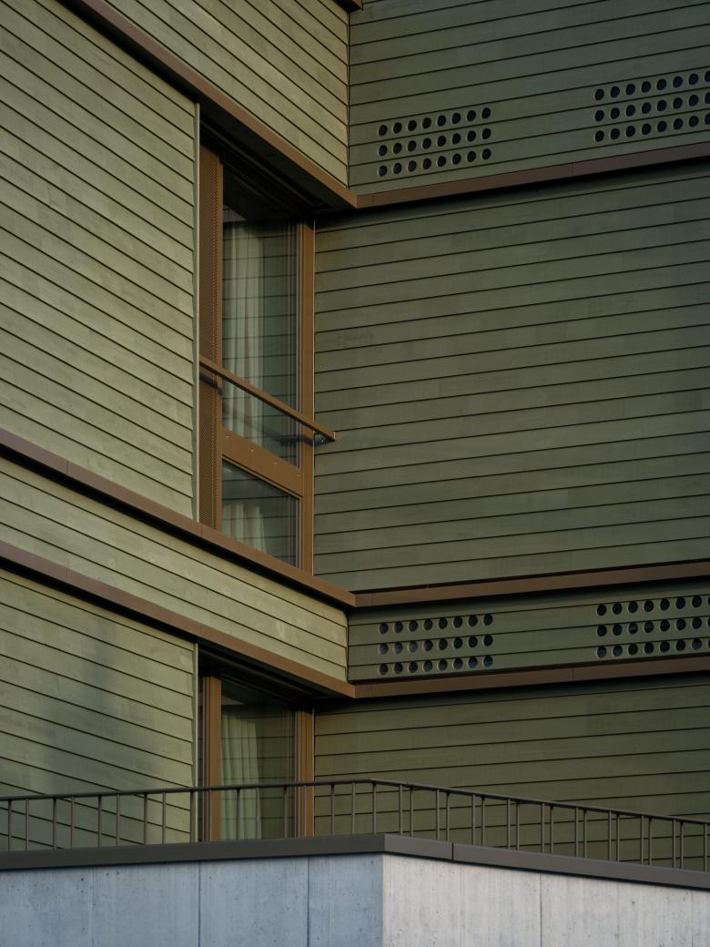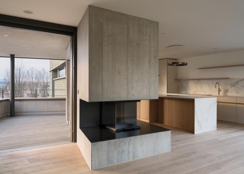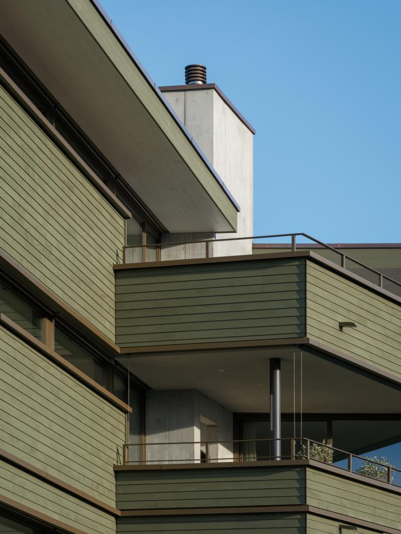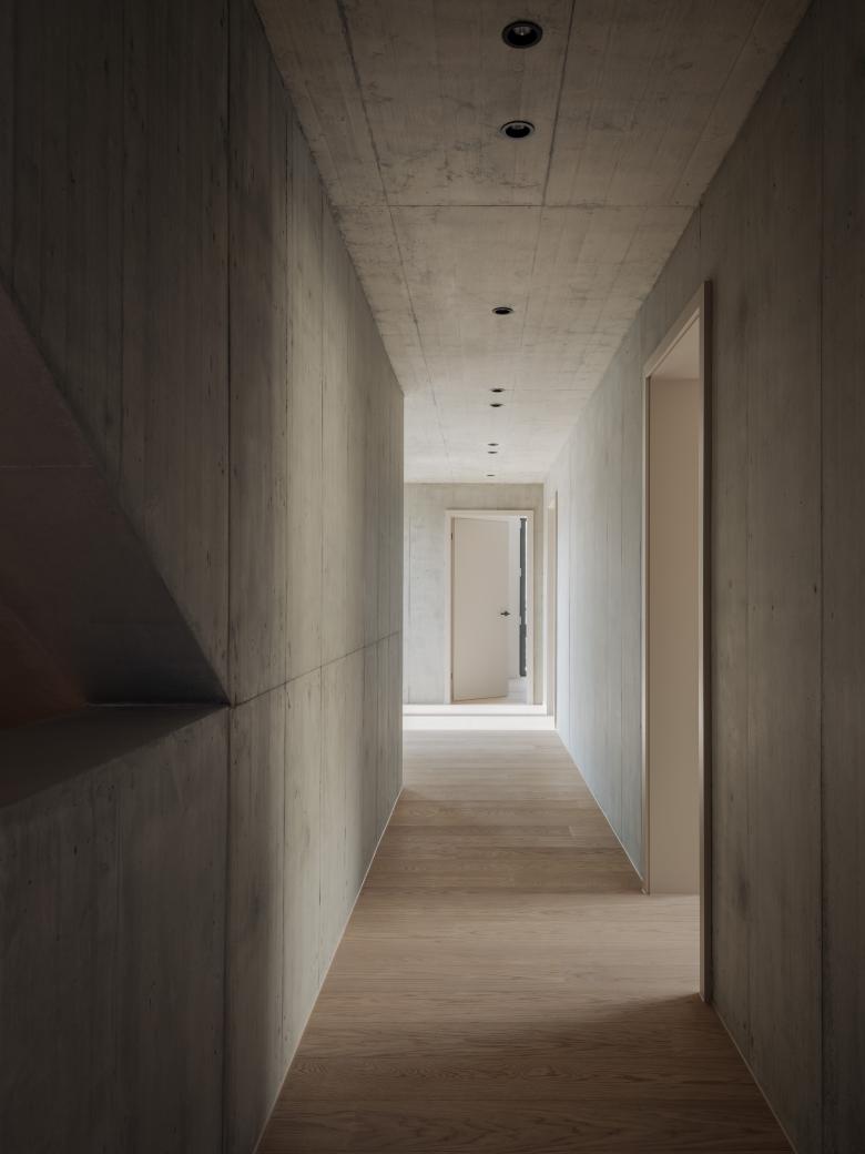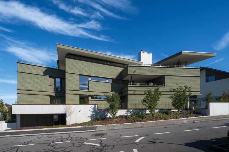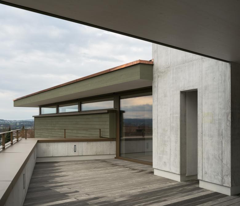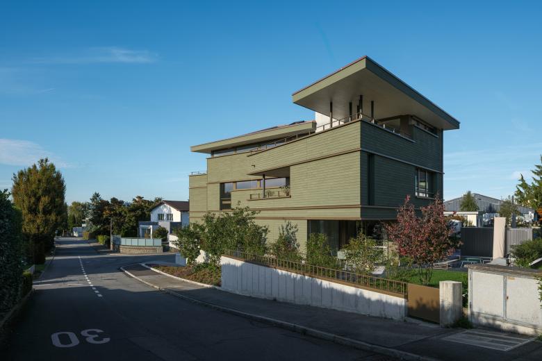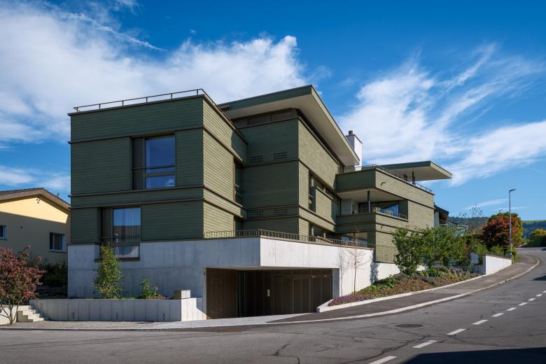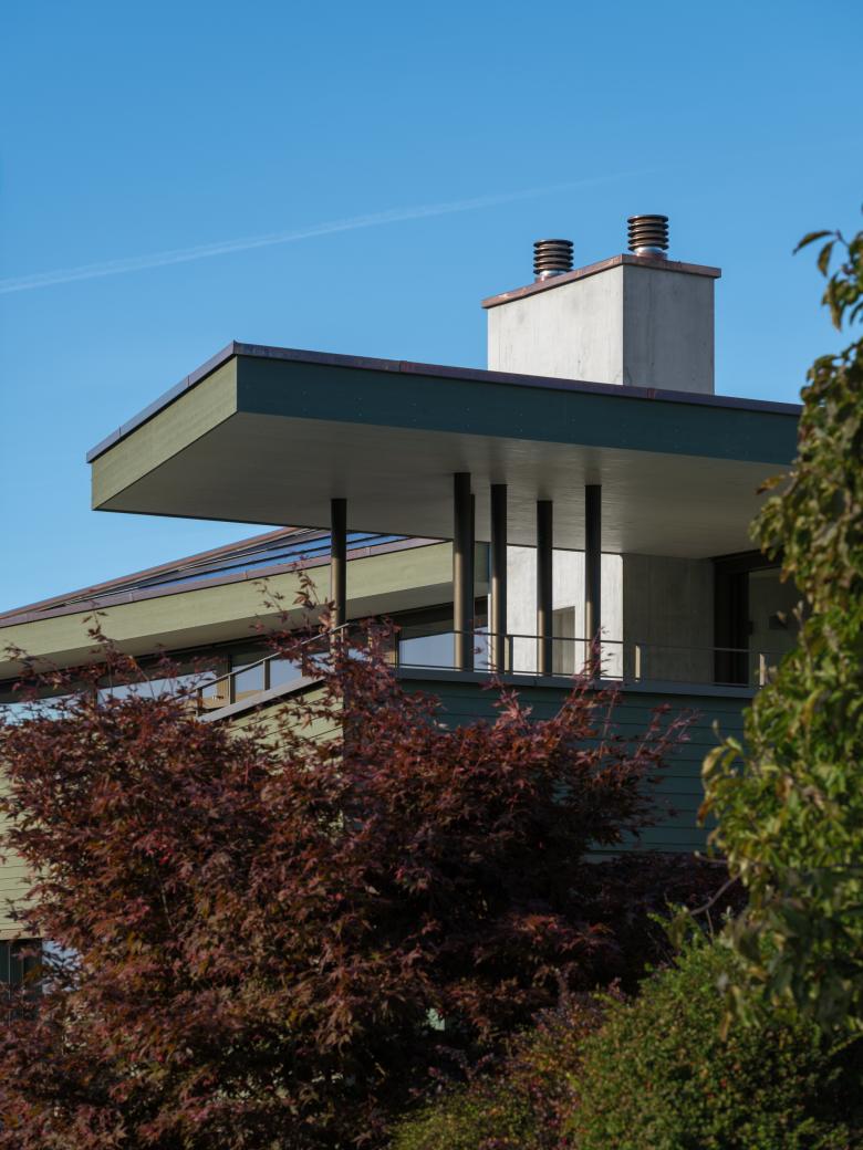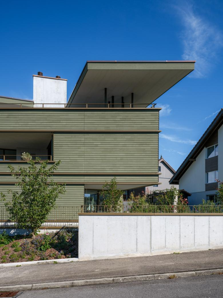 Grosszügige Vordächer schützen das Gebäude und setzen klare Abschlüsse nach oben. Die Fenster vermitteln zwischen Innen und Aussen und bilden zusammen mit den horizontalen Fassadenelementen eine spannende Komposition, die sowohl Privatsphäre als auch Ausblicke ermöglicht.