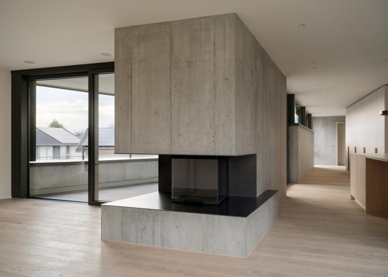 Die mittige Treppenskulptur und der zentrale Kamin gliedern die horizontal ausgerichtete Bauform und schaffen zugleich vertikale Akzente. Die Kombination aus massiver Betonkonstruktion und einer hinterlüfteten Holzfassade aus einer sägerohen Fichteschalung mit schilfgrüner Schlammfarbe verleiht dem Haus eine markante, zugleich zurückhaltende Präsenz im Gelände.