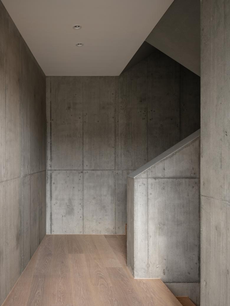 Herzstück des Entwurfs ist die zentrale gegenläufige Treppenanlage, um die sich die beiden Wohneinheiten gruppieren und verschachteln. Die gegenläufigen Treppen verbinden die einzelnen Geschosse so, dass Wohnbereiche und Kinderzimmertrakte wechselseitig auf unterschiedlichen Ebenen liegen. Im Dachgeschoss befinden sich die Elternschlafbereiche, die mit einer unterschiedlich geneigten Deckenlandschaft zusätzliche Raumhöhe und Spannung erzeugen. So profitieren beide Wohnungen in unterschiedlichen Höhenlagen von einer 360°-Rundumsicht und Licht von allen Richtungen.
