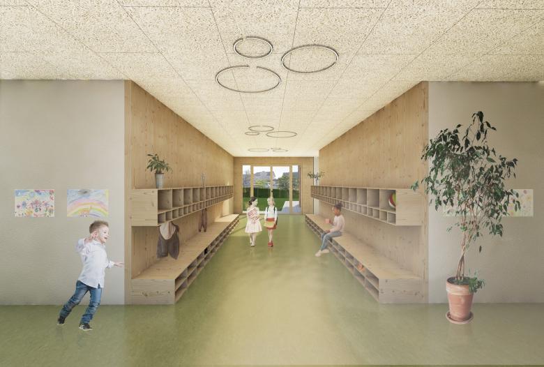 Vorgelagert zum Haupteingang befindet sich der überdachte Aussenraum. Er dient sowohl als Pausenraum bei Regenwetter, als auch als Wartebereich bei der Ankunft der Kinder. Der Hauptunterrichtsraum bietet die Möglichkeit zur Bildung von Nischen. Seine grosszügige Verbindung zum Gruppenraum schliesst dessen separate Nutzung nicht aus, lässt aber auch die Integration in den Hauptraum zu.