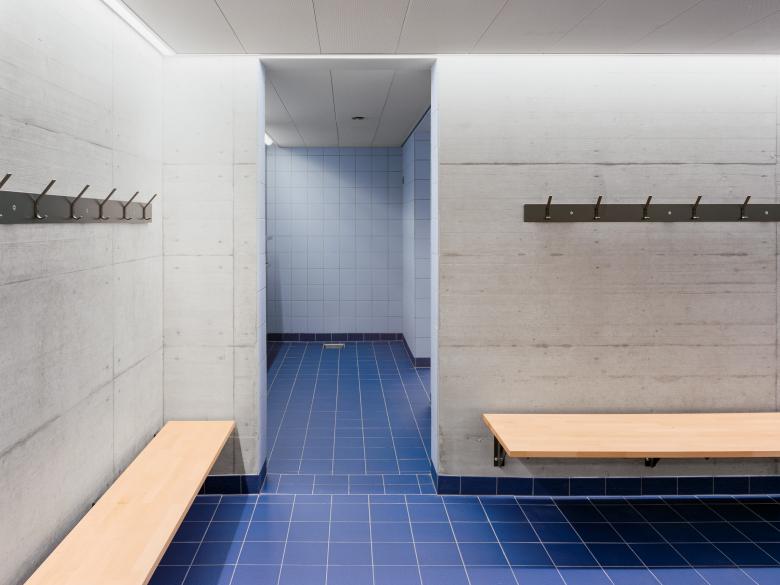 Die Sporthallen sind halb unterirdisch geplant. In einer Zwischenschicht im Untergeschoss sind die Sporthallengarderoben, die so von der Tiefgarage aus leicht zugänglich sind. Diese Nebenräume bilden gleichzeitig eine durchlässige Pufferzone zwischen den Sporthallen und der Tiefgarage.