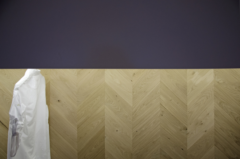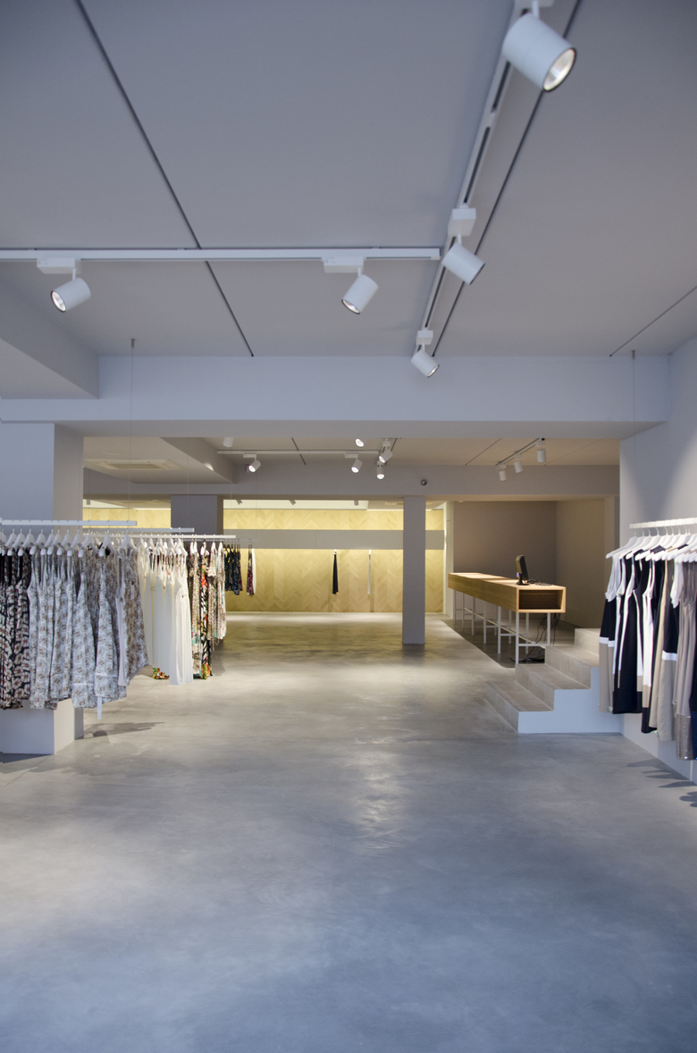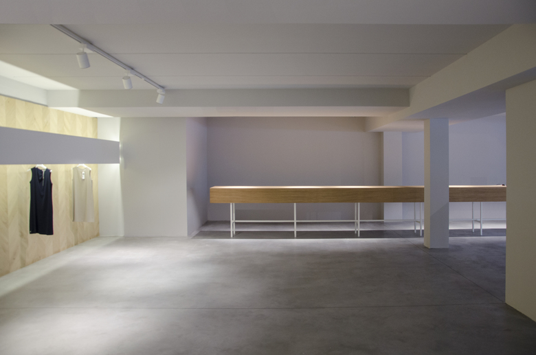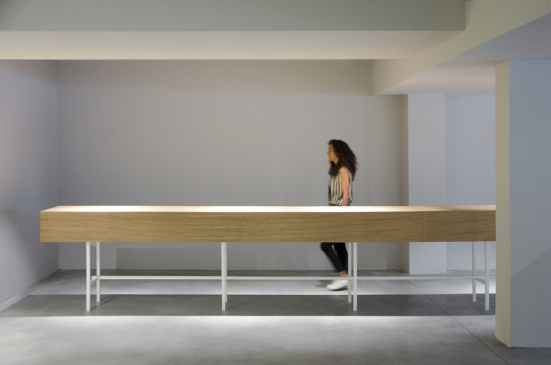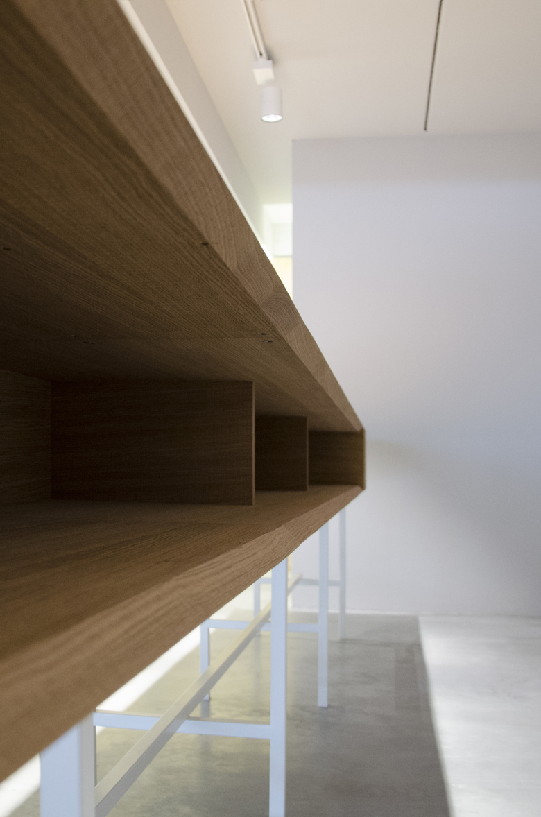 The concept store is characterized by the presence of a long display wall covered with oak herringbone that is shaped like the bottom of the exhibition space, a large skeletal desk made in oak sawn and a ceiling system consisting of bars that mark the extent of the space.
