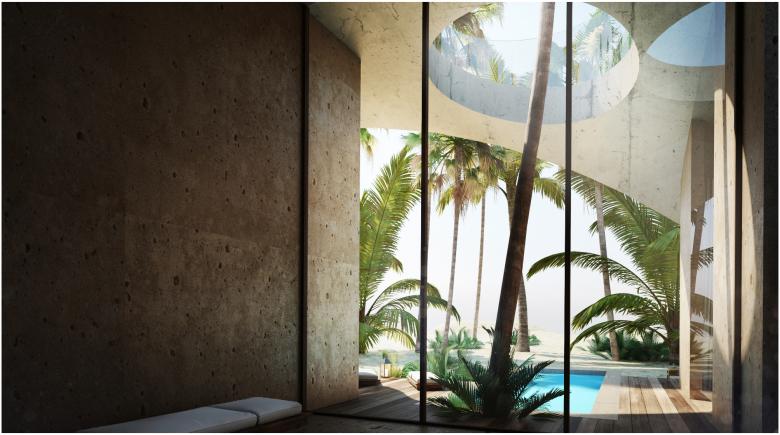 Immersed in an impressive oasis, it was designed according to the topography of the place. A place to arrive and observe the desert from within.