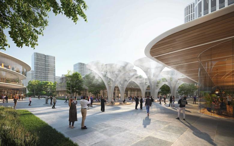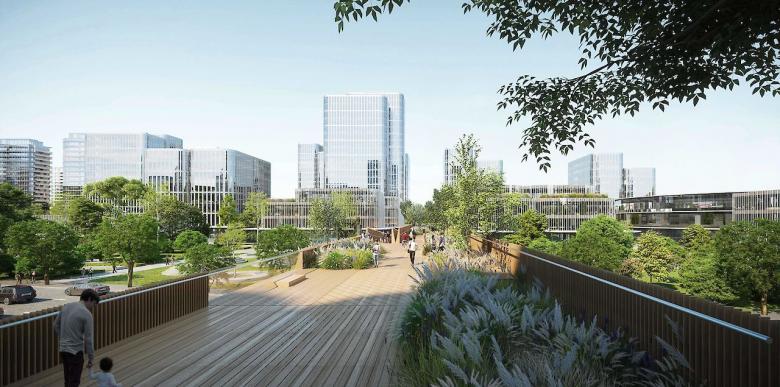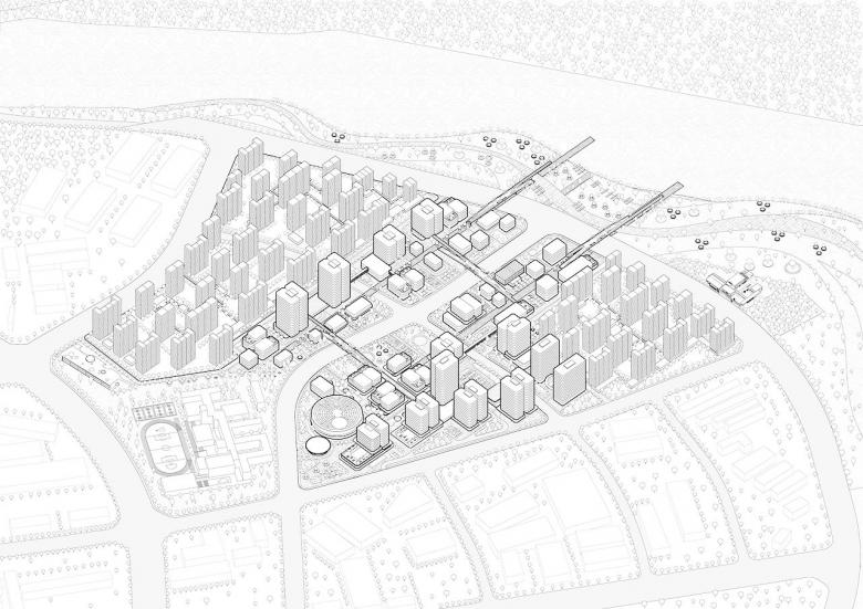 住宅和办公塔楼被推往地块的南北侧以便为中心的绿地和低层‘ECO-Spine’创建空间。而办公大楼位于项目南部的“金融街”。 会议中心,剧院,陈列室,低层零售单元和办公空间在‘ECO-Spine’的景观区内并可以通到项目东侧的河岸。ECO桥将四大地块相连,因此项目名称‘ECO-BD’充分反映了设计对生态可持续性的重视。