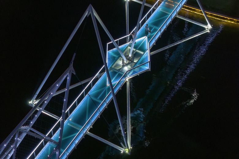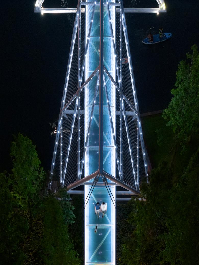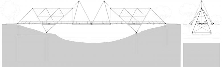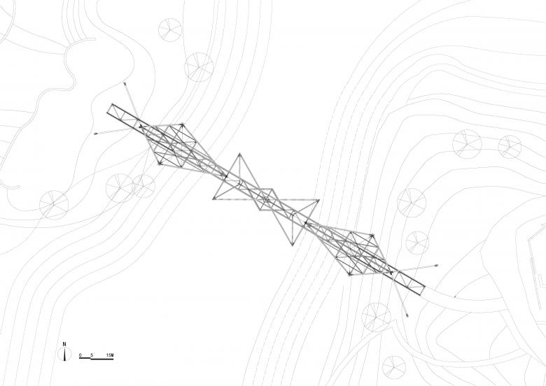 桥的灵魂在于形式与结构的统一,形式的简洁等于结构的高效。步行桥采用了张拉结构体系,两侧的三棱锥钢架结构是桥身两端的主塔,均以其两角着地成为支点,靠岸端的上角被两侧的抓地拉索下拉固定,驱动这些钢缆,便使连接在主塔面水端上角的拉索中产生了预应力,吊起了另外两个正置的三棱锥,使之悬浮于水面之上。桥面两端通过滑动支座固定于两岸,四个三棱锥所形成的结构托起了长达80米(最大跨度50米)的玻璃步行桥,从而共同形成了整体稳定的结构体系,并产生了“轻盈”之美。