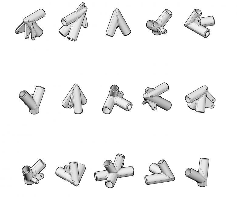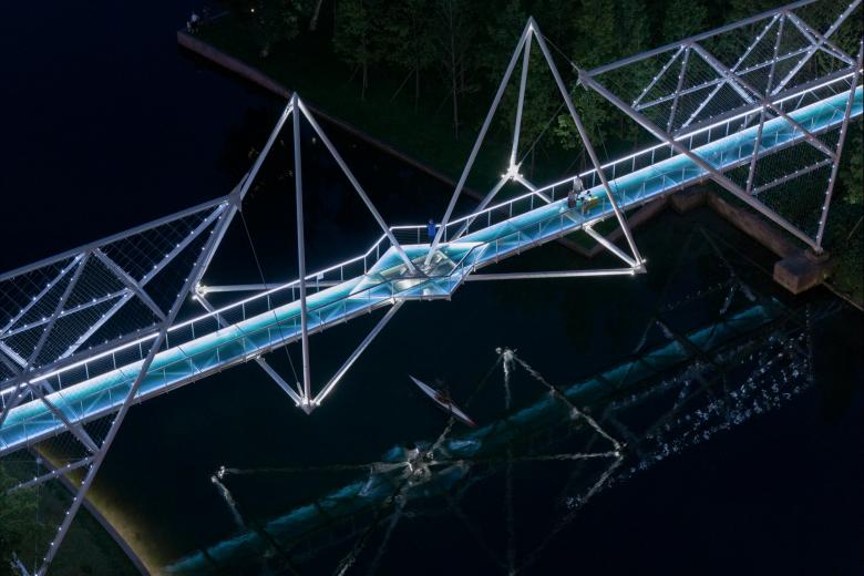 为了使结构的几何形态更加的纯粹简洁,三棱锥体的角部定制了分叉的铸钢构件,锥身杆件套插在其分支上,从而构建了纯净而整体的几何形态。桥中间的两个正置三棱锥底部杆件的交叉点落在了桥面的正中心,桥面形态在这一点上顺势变化为菱形,成为水中央的驻足平台。结构是空间的基础,空间的变化是结构逻辑自洽的产物。整个结构体系没有任何冗余的装饰杆件,白色的对称几何框架尽显结构的自明性。