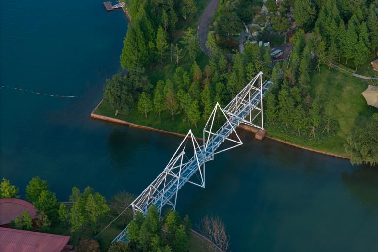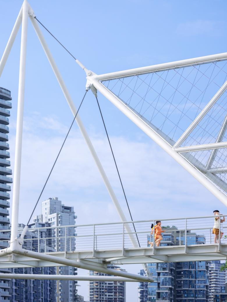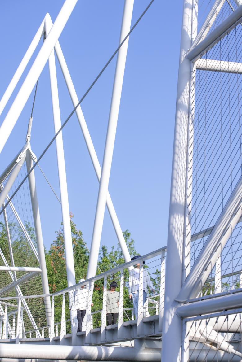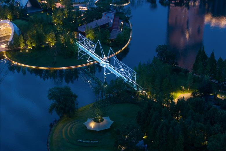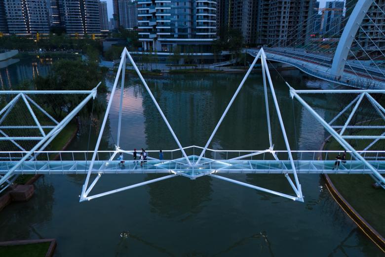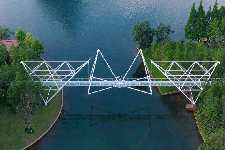 麓湖伊甸岛步行桥在提供通行的基本功能外,使游人领略到了几何结构之美。它是对自然秩序的另一种表达,与人类的智性相契合。悬浮的几何形体举重若轻,使漫行者感受到绿岛与水天之间的一抹灵韵(genius)。