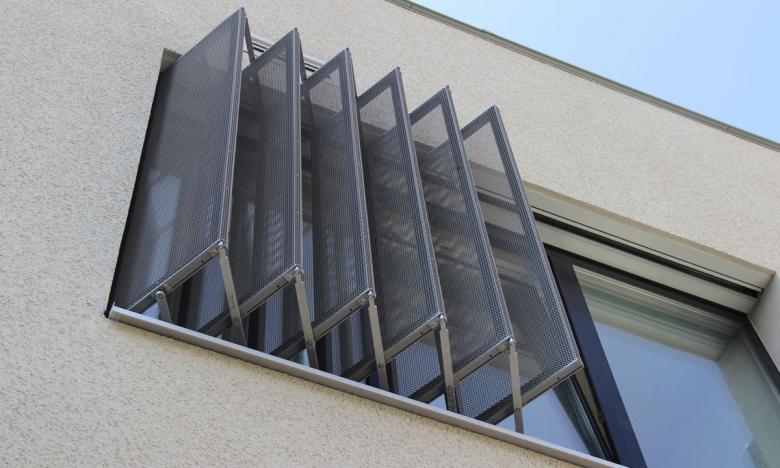 Genutzt wurde für die Faltscherenläden das Aluminiumstreckmetall Typ Leoben – Masche 16x8 mm - mit einer Stärke von 1mm in Kombination mit dem Rahmenprofil H 40x31 mm.