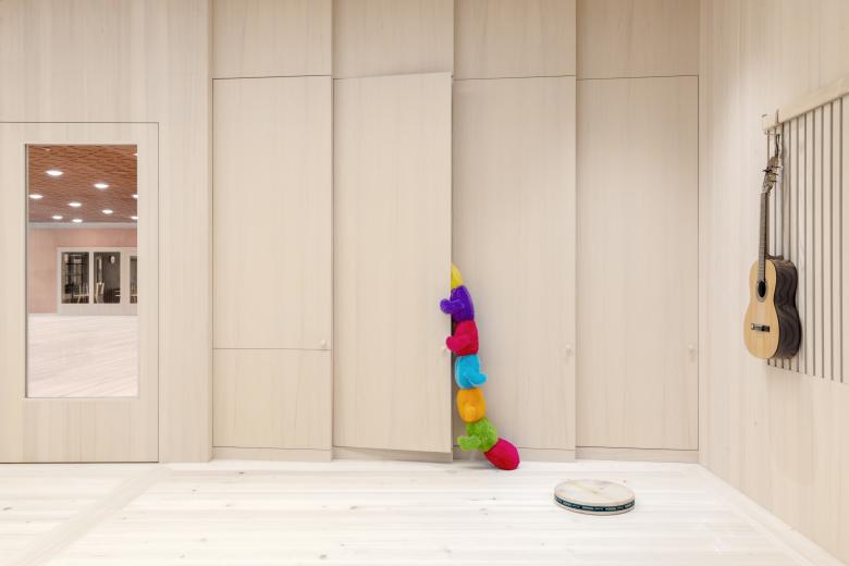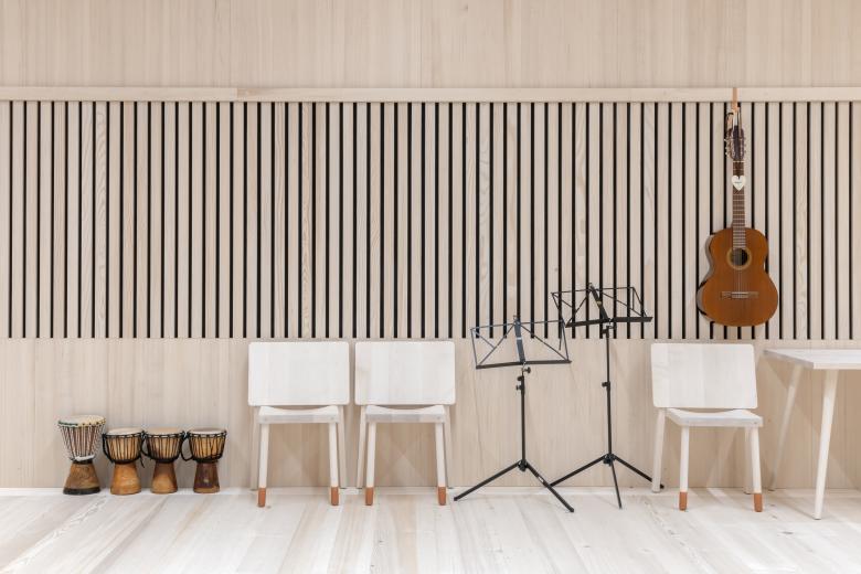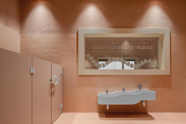 Holz (Weißtanne), als Massivholz für Böden und Möbel, bildet in Klassen- und Gruppenräumen den haptischen Grundton. Die warmen, hellen Oberflächen erzeugen Geborgenheit und sind so gewählt, dass sie mit jeder Berührung und jeder Nutzung an Ausdruck gewinnen.