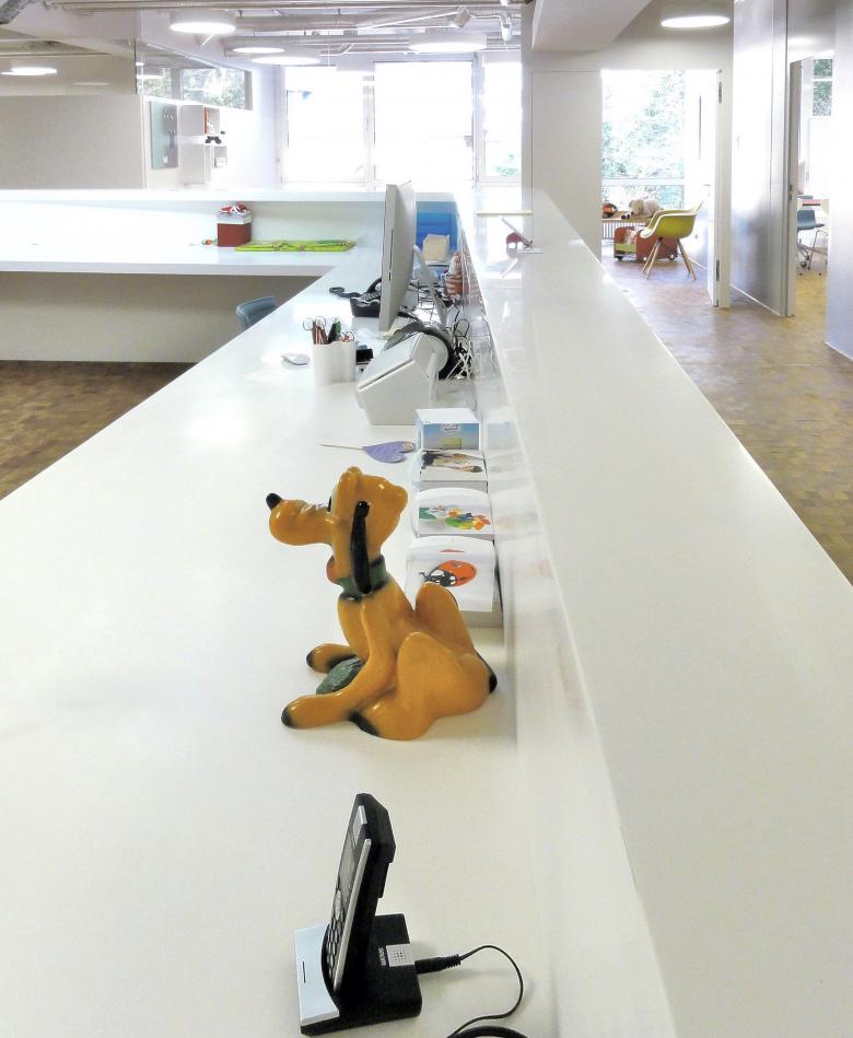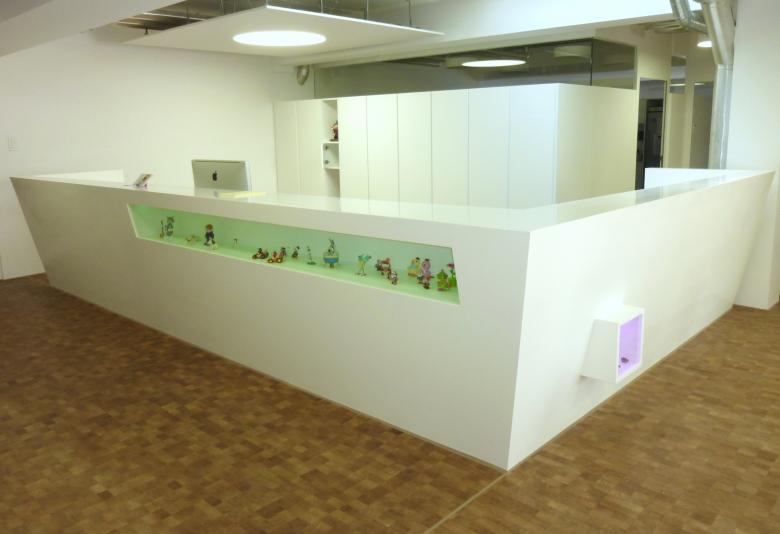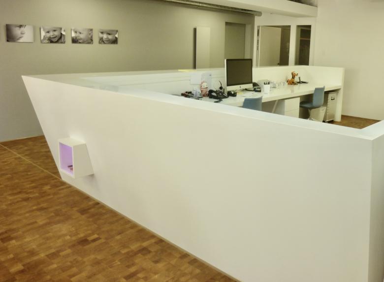 Durch die Lage der Empfangstheke und den anderen Nebenräumen im Inneren der Räumlichkeiten ist es uns gelungen, den Warteraum als auch die drei Praxisräume in die Bereiche mit Fenstern zu platzieren. Das grosse Empfangsmöbel aus Staron (ein gegossenes, porenloses Massivmaterial, das überwiegend aus einem hochwertigen Naturmineral besteht) mit dem auf Augenhöhe der Kinder eingebauten Vitrinen samt veränderbarer Beleuchtung ist das „Highlight“ der Praxis. Die vielen bestehenden Leitungen an den Decken wurden mit heruntergehängten Elemente mit integrierter Beleuchtung teilweise kaschiert.