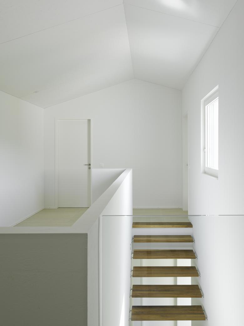 Die Haupträume Wohnen und Essen stehen sich um Erdgeschoss gegenüber. Sie umschliessen den Hof, der sich zum Obstbaumgarten hin in einen privaten Aussenraum öffnet. Diese Gegenüberstellung ermöglicht Durch- und Einblicke und lässt die Bewohner das eigene Haus von Innen betrachten. Sowohl der Essbereich als auch der Treppenraum weiten sich nach oben und machen so aufgrund ihrer Dachgeometrie einen besonderen Raum erlebbar. Die Schlafkammern sind im Obergeschoss, zurückhaltend durch einzelne Fenstern an der Fassade erkennbar.