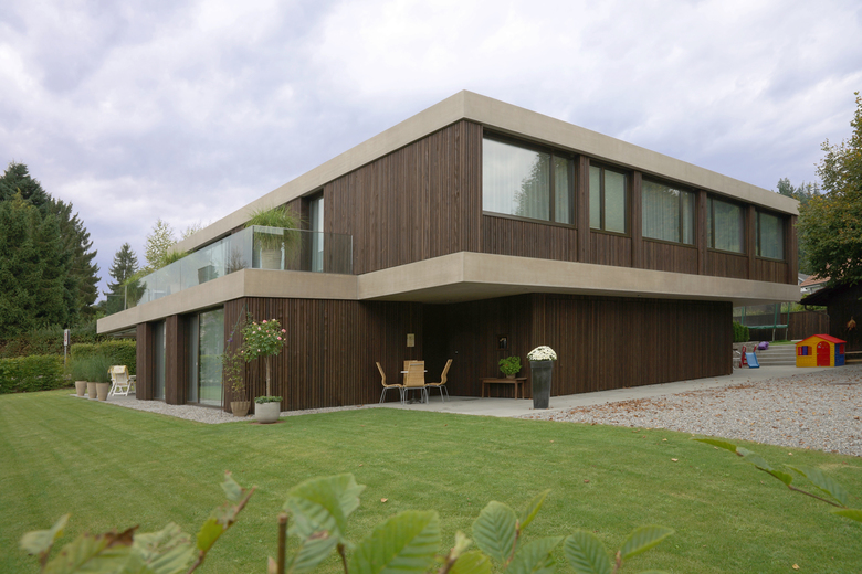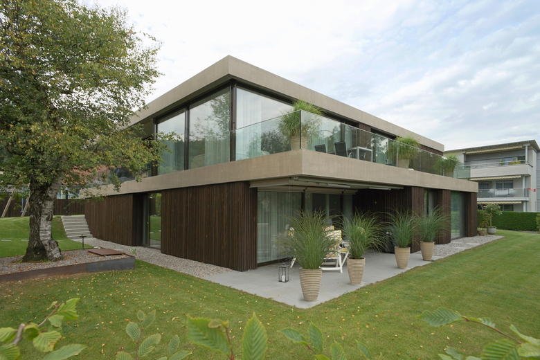 Das grosse Grundstück ermöglichte eine Anordnung der Räume auf nur 2 Geschossen, wodurch eine Betonung der Horizontalen und in der Folge eine Eleganz erreicht werden konnte, wie sie sonst nur mit grösseren Raumprogrammen möglich gewesen wäre. Das Konzept wurde mit den umlaufenden, lasierten Sichtbetonbändern und sägeroh belassenen, dunkel lasierten Holzfüllungen zusätzlich verstärkt.