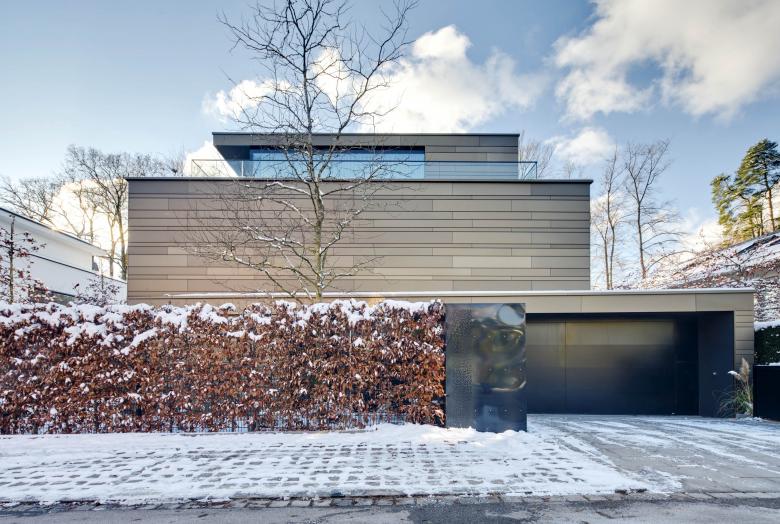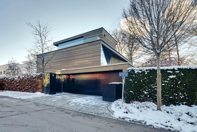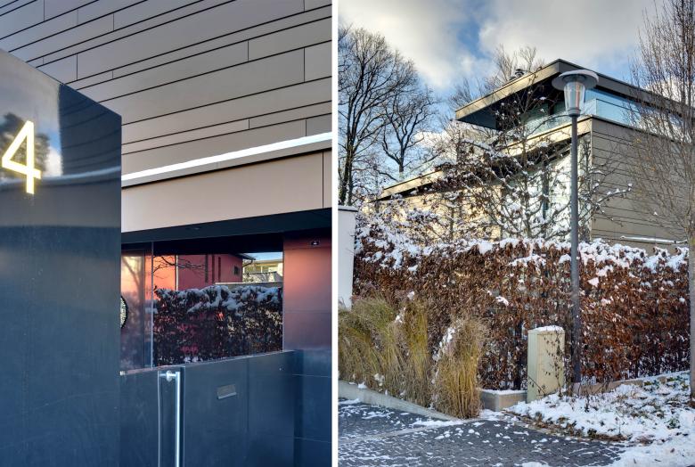 Zentrales Thema dieses Entwurfes wurde die Fassade mit teils gelochten Aluminiumplatten sowie die markanten und großflächigen Öffnungen mit flächenbündigem Stufenglas. Kleinteilige Öffnungen wurden somit hinter der Metallfassade versteckt. Durch besondere Details wie die heraus- und hineinfaltenden Fassadenflächen oder die extrem reduzierten Gebäudeecken - Stufenglaskante trifft auf Metallpaneel - geben dem Architektenhaus das einzigartige Erscheinungsbild.