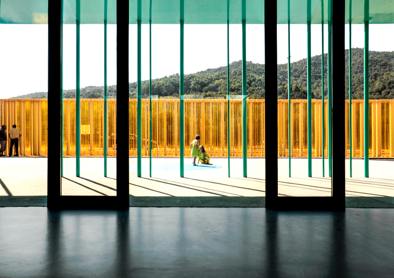 The new municipal school, built to free up the old site in the town, has approximately 80 children occupying its 1000 square meters. From the exterior, the almost rectangular building appears simple. Vertical tubes (some of them structural) of different diameters create a perimeter using a rainbow of colors, which some have likened to giant colored pencils surrounding the building. Some of the tubes rotate and invite the children to play. Floor to ceiling glass is used to enclose much of the building, so that natural light full of color filters in.