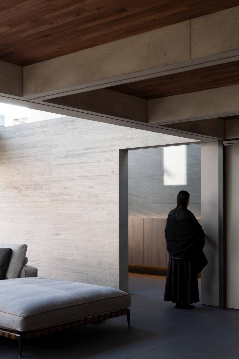 またコンクリート梁とウォルナット縁甲板張のコンビネーションによる格天井が住居空間全体に広がり、独特のリズムや調和を生み出しながらインテリアのベースをつくり上げています。