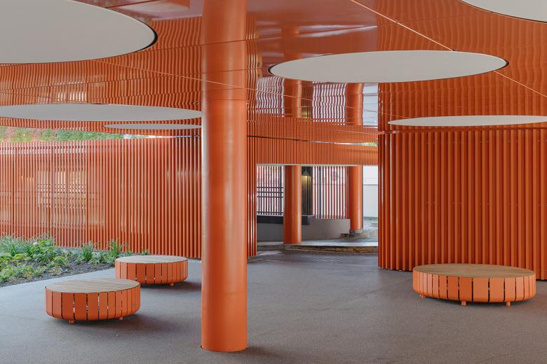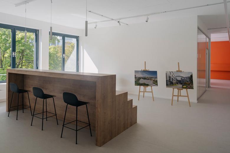 Schon beim Ankommen setzen modernisierte Eingänge, klare Signaletik und aufgewertete Fassaden neue Akzente. Begrünte Außenanlagen und Dachterrassen laden zum Verweilen ein, Sitz- und Kommunikationszonen fördern Austausch und gemeinsames Arbeiten. Innen entsteht durch frische Farb- und Lichtkonzepte, Motivwände und eine markante Lichtinstallation eine neue Atmosphäre. Mit der Marketinglounge im zweiten Obergeschoss – ausgestattet mit Loungebereichen, Meetingraum und Teeküche – entstehen Räume, die Offenheit und Kommunikation fördern.