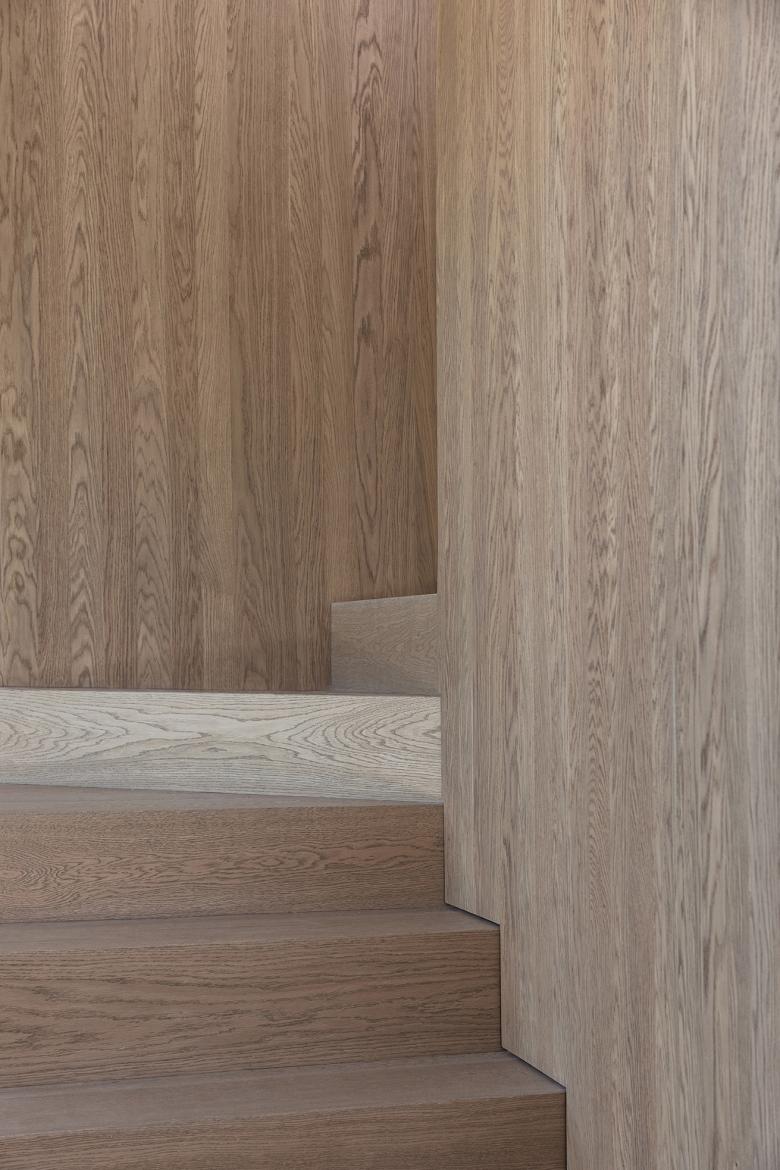La planta baja, que aloja la zona de día, está conectada sin interrupciones con el exterior, formando un espacio fluido entre la sala de estar, la cocina y la terraza. La unidad de almacenamiento, ejecutada en madera de roble smoked, acompaña toda la parte baja de la casa e integra el núcleo de la escalera.