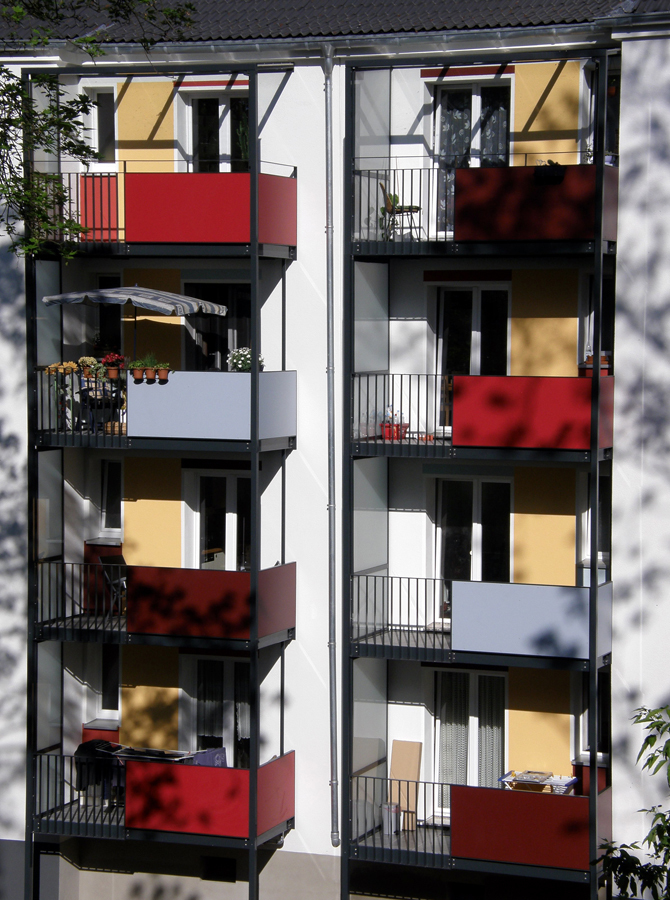 Bei den Wohnhäusern handelt es sich um eine Siedlung von 6 freistehenden Nord-Süd-Zeilen aus dem Bestand der GWG Köln-Nord. Die notwendige energetische Sanierung umfasst die vollständige Erneuerung der Gebäudehülle und richtet sich nach den Förderbedingungen der Kreditanstalt für Wiederaufbau. In diesem Zusammenhang wurden die alten schlecht nutzbaren Balkone abgetrennt und durch vorgefertigte Metallkonstruktionen ersetzt. Durch die unterschiedliche Kombination der Grundfarben rot, Blau und Gelb bei der Gestaltung der Balkonanlagen enstand statt der endlosen Wiederholung von nahezu 300 gleichen Bauelementen ein lebhaftes Spiel leuchtender Farbflächen, das die Wohnanlage trotz der strengen Zeilenstruktur freundlich und einladend erscheinen lässt, ihr einen lockeren und individuellen Anstrich gibt.