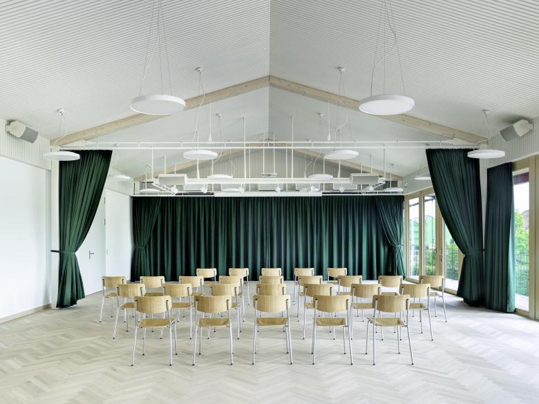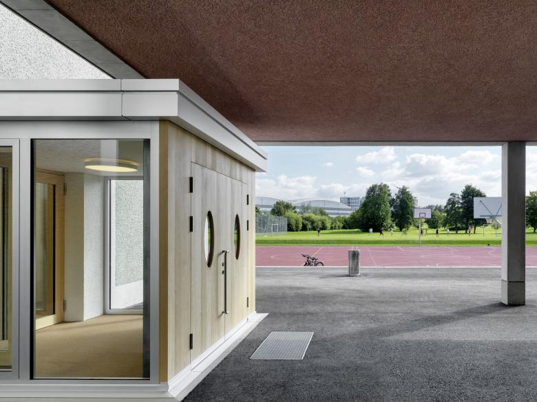 Der Ergänzungsbau des Schulareals ist in drei Bereiche gegliedert: Der erste Bereich, angefügt an die Turnhalle, organisiert die Funktionsräume. Angrenzend liegt die Erschliessungszone mit sämtlichen Verkehrsstrukturen. Im äusseren Bereich nach Süden sind alle Nutzräume angeordnet. Die hoch flexible Gestaltung der inneren Struktur hält den Nutzungsänderungen der nächsten Jahrzehnte stand.