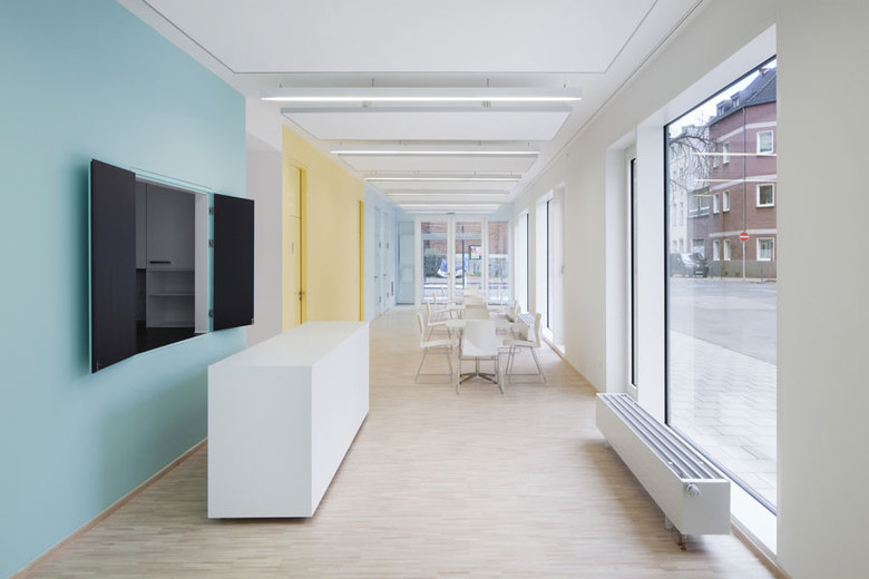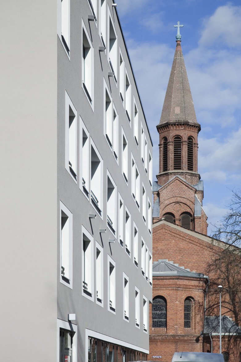 Die bestehenden Raumkanten entlang der Vogelsanger Straße und der Fröbelstraße wurden mit einer geschlossenen Bebauung ergänzt und wiederhergstellt. Straßen und Platzräume dadurch neu definiert. Als Herzstück der 6-geschossigen Wohnanlage ist im Erdgeschoss auf 245qm das Gemeindezentrum untergebracht. Eine einladende Glasfront entlang des Fröbelplatzes stellt die direkte Sichtbeziehung zur Friedenskirche her. Die funktionale und inhaltliche Beziehung der Friedenskirche und Gemeindeeinrichtung wird architektonisch abgebildet und nach außen erkennbar gemacht.