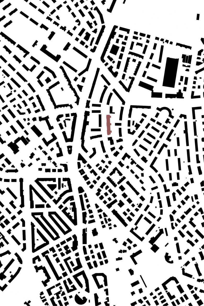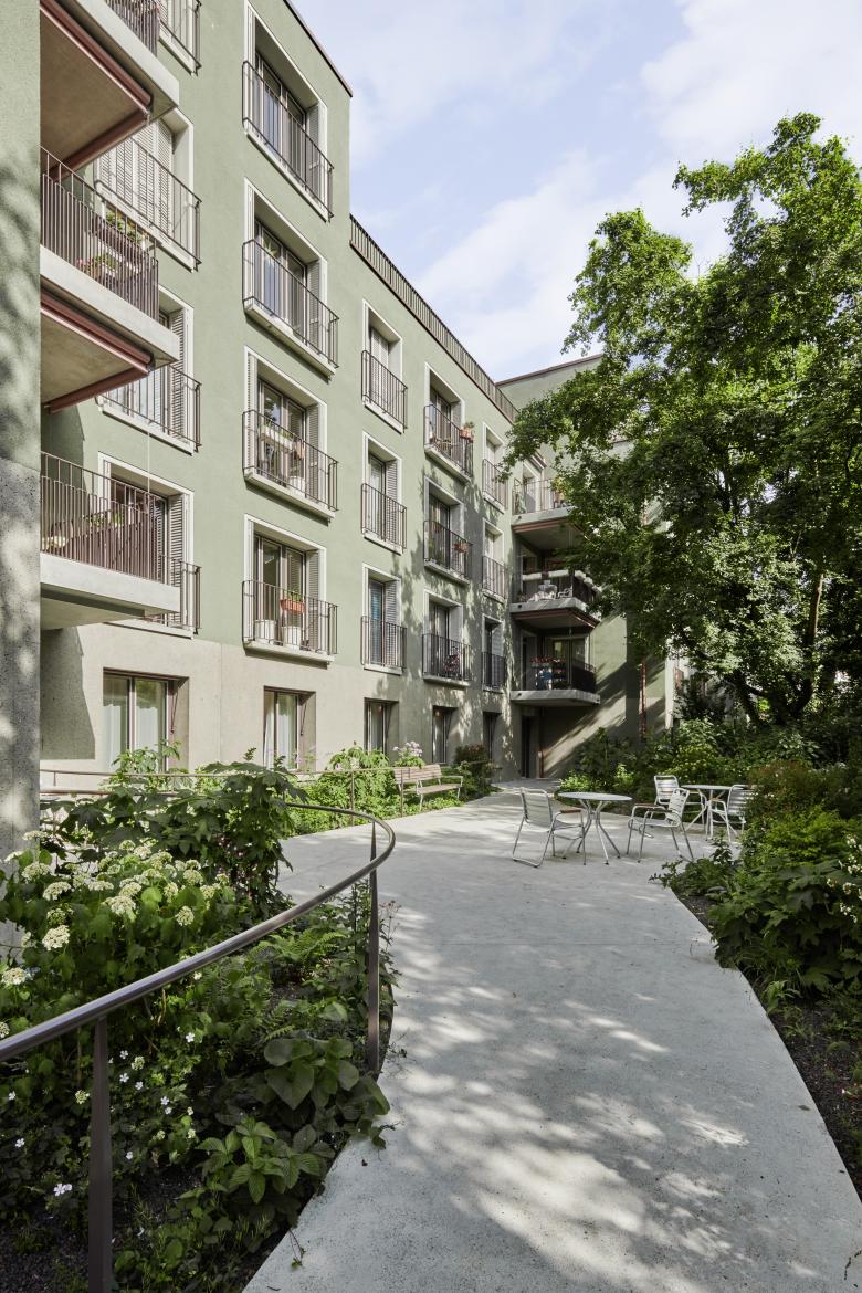Die grosse Qualität in diesem Stadtgebiet besteht aus der Struktur von strassenbegleitenden Zeilenbauten, die als zusammenhängende Figur grosse Freiräume im Innern ermöglichen. Diese Typologie gilt es weiter zu entwickeln. Somit gliedert sich der Ersatzneubau in die bestehende Zeilenbaustruktur ein und generiert durch drei räumliche Ausstülpungen gegen den Gartenraum die verlangte Dichte. Grosszügige Gebäudelücken ermöglichen den Blick in den siedlungseigenen, durchgrünten Hofraum. Die räumliche Verzahnung des Hauses mit dem Gartenraum im Osten schafft Intimität und ermöglicht nachbarschaftliche Kontakte.