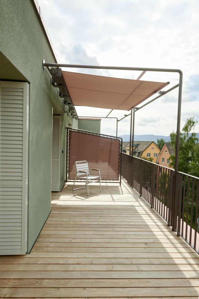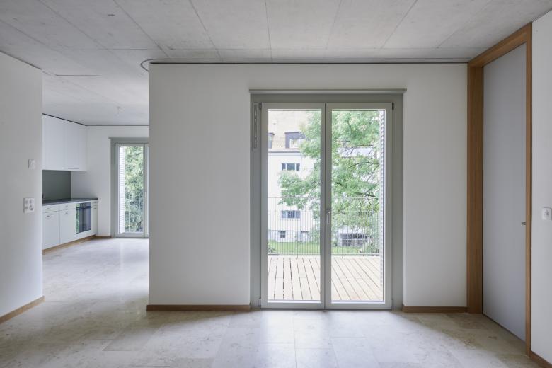 Die Küchen mit Essbereich bilden das Herz der Familienwohnungen in den Regelgeschossen. Ein Lichtschacht versorgt die innenliegenden Küchen mit Tageslicht. Der hofseitige Essbereich mit grosszügiger Öffnung ermöglicht den Blick auf das Treiben im Garten. Dagegen findet sich das ruhigere Wohnzimmer mit vorgelagertem Balkon an der Westseite. Mit kleinen Ausnahmen im Attikageschoss kann das Wohnzimmer mittels Flügel- oder Schiebetüren abgetrennt werden. Die Nassbereiche wurden möglichst zusammengelegt und unweit der Schlafzimmer angeordnet. Bedingt durch die Geometrie des Attikageschosses sind hier die Wohnungen unkonventioneller im Grundriss, umso mehr profitieren sie von den grosszügigen Terrassen und der Aussicht.