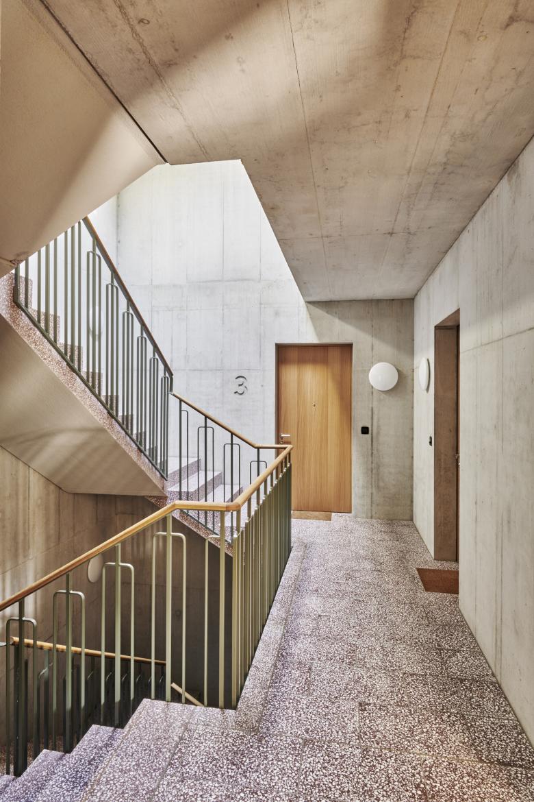 Die Erschliessung der Wohnungen erfolgt über drei gleichwertige Treppenhäuser mit Lift. Durch die beengten Raumverhältnisse im Erdgeschoss werden die Abstellräume und Waschküchen mehrheitlich im Untergeschoss untergebracht. Ein ebenerdiger Kellereingang im südlichen Gebäudeteil bietet hier einen zusätzlichen, schwellenlosen Zugang. Die Gliederung der Nutzungen in Keller, Pflegewohngruppe im Erdgeschoss und drei Wohngeschossen erfolgt horizontal, wobei die Wohngeschosse als Drei- und Vier-Spänner konzipiert sind.