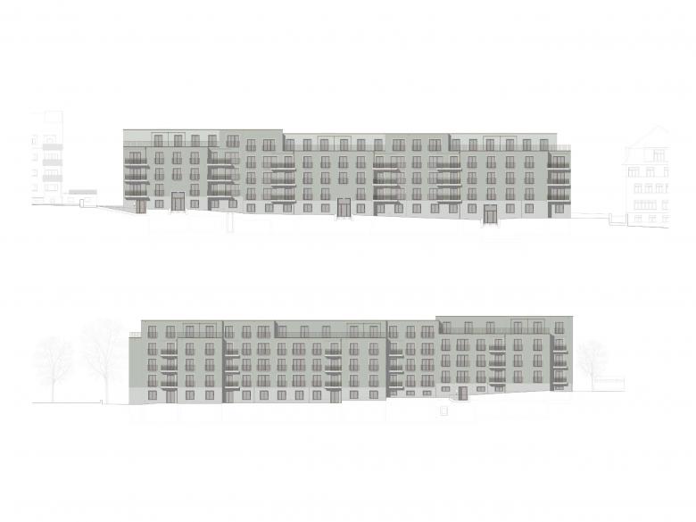 Die Staffelung des Volumens prägt das Fassadenbild auf der Westseite und in ausgeprägter Form auf der Ostseite. Dies wird durch eine regelmässige, ruhige Fenstereinteilung unterstützt. Die an die Gebäudeecken angefügten Balkone lockern den muralen Charakter des Gebäudes auf. Analog der bestehenden Siedlungsbauten wird eine verputzte Aussenhaut vorgeschlagen, welche aber in ihrem konstruktiven Aufbau mittels eines Holzständerbaus die Ziele der Nachhaltigkeit optimal unterstützt.