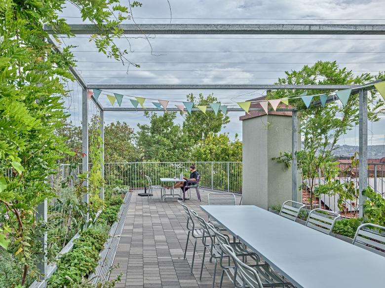 Auch die strassenseitige Fassadengestaltung bezieht sich in Rhythmus, Proportionen und baulichen Elementen stark auf den vorgefundenen quartiertypischen Ausdruck. Zum Hof wird eine offene Treppenanlage vorgeschlagen, welche als Ort der Begegnung dienen soll. Ein grosszügiger gedeckter Durchgang zum Innenhof erschliesst einen Gemeinschaftsraum für die ganze Siedlung. Vom Leonhard Ragaz Weg her erschlossen wird ein Kindergarten der Stadt Zürich, auch dieser erhält einen direkten Ausgang auf den Hof.