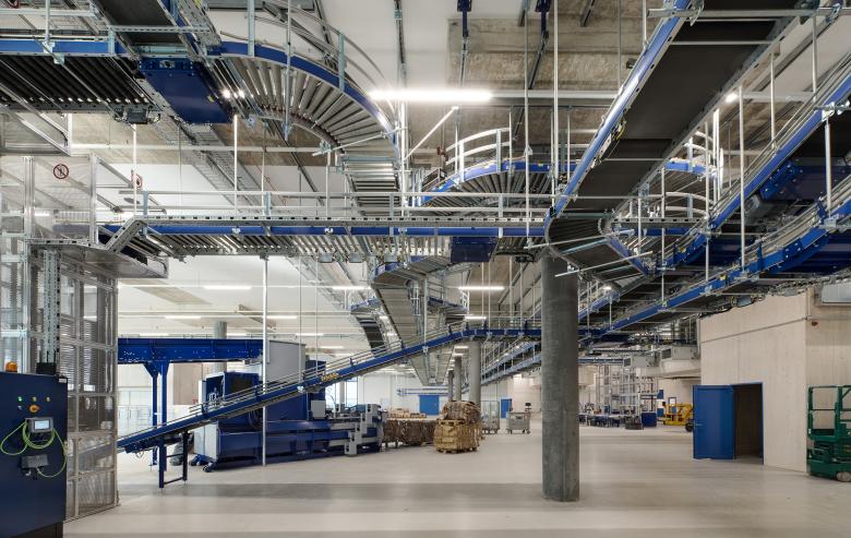 Der Bau gliedert sich in zwei Teile. In der einen Hälfte (Modul 7) ist das automatische Paletten-Hochregallager untergebracht. Es liegt direkt auf dem Betonfundament und zieht sich bis auf eine Höhe von knapp 31 Metern. Der andere Teil des Gebäudes (Modul 8) umfasst die Anlieferung der Waren über neun Andockrampen, die Bereiche für die Einlagerung und Kommissionierung im EG und 1. OG sowie das Hochregallager für mittelgrosse Teile ab dem 2.OG.