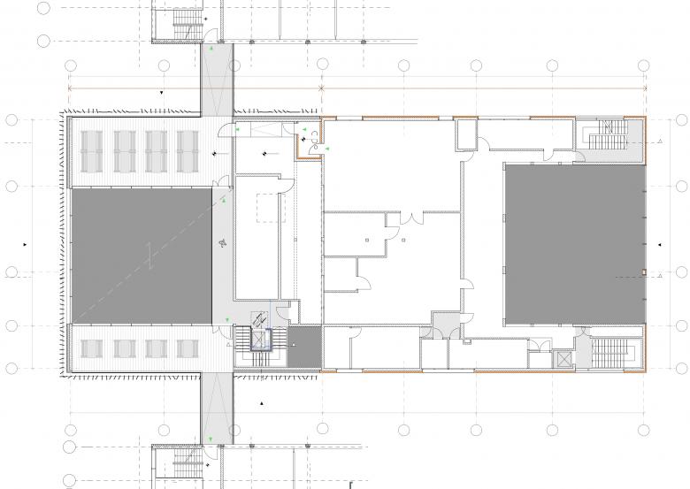 Anlieferung sowie Feuerwehrzufahrt im Erdgeschoss westlich der bestehenden Mensa werden erhalten und liegen unterhalb der zukünftigen Erweiterung mit einer lichten Höhe von min. 4,20 m über dem Anlieferungsniveau . Ebenso wird das Erschließungs- und Rettungswegekonzept für den Bestand nicht geändert. Lediglich die 1,20m breite Haupttreppe, wird durch eine Treppe mit einer lichten Breite von 1,80m ersetzt.