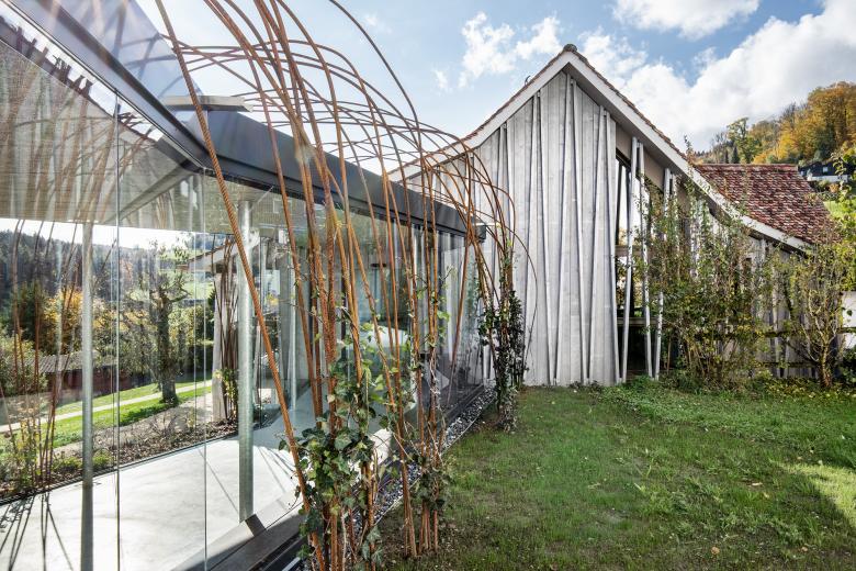 Der neue Heimbereich wird mit einem leichten, teils begrünten Durchgang verbunden, der für einen reibungslosen Ablauf des Betriebs unerlässlich ist und den Bewohnern neben gemütlichen Sitznischen auch mehr Bewegungsfreiheit bietet. Der anregende Durchgang gibt wunderbare Ausblicke in die Umgebung und bis hin zu den Alpen frei. Ziel des Verbindungsbaus ist, diesen optisch in die Umgebung zu integrieren, damit er als Teil des Gartens und nicht als massives Bauwerk in Erscheinung tritt.