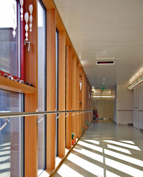Das bestehende Betongebäude aus dem Jahr 1977 mit seiner Lochfassade wird in der Nordwestecke ergänzt und bildet, in analoger Ausführung zum Vorhandenen, im Endzustand einen nahezu perfekten Würfel. Zwischen Spitalbau und Pflegeheim wird ein neuer Gebäudeteil eingefügt. Dieser hat einerseits die Aufgabe, die beiden unterschiedlichen Funktionsbereiche räumlich zu trennen, bildet aber gleichzeitig für die Bewohner und Mitarbeiter mit Empfang, Cafeteria und Kiosk einen wichtigen Knoten- und Treffpunkt. Die differenzierte Gestaltung als transparenter, leichter Glaskörper macht die funktionale Trennung der beiden massiven Bauten Spital und Pflegeheim optisch deutlich und verstärkt die einladende Wirkung in seiner Funktion als Haupteingang und Empfangsbereich.