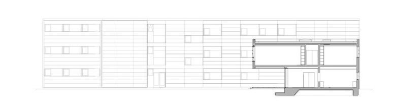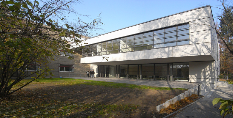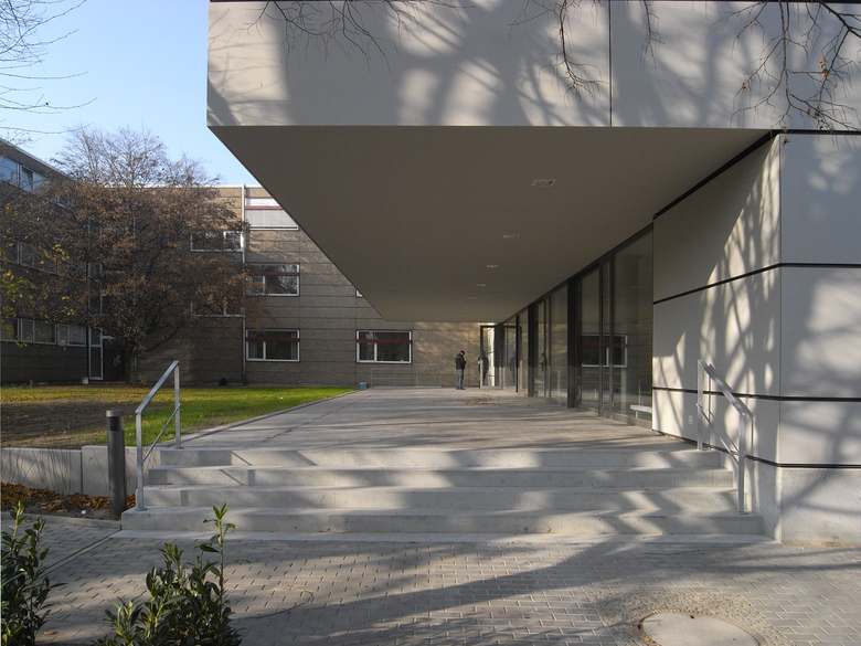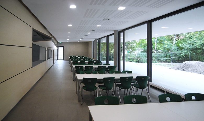 Im Erdgeschoss des Erweiterungsbaus befinden sich im Süden ein Foyer, sowie an der Gartenseite der Speiseraum für ca. 60 Schüler. Dieser Speiseraum öffnet sich entlang der Längsseite über eine vorgelagerte, überdachte Terrasse zum Garten hin. Auf der Nordseite wurde die Küche mit ihrer Anlieferung und den Personalräumen vorgesehen. Über eine großzügige Treppe erreicht man das Obergeschoss welches ebenfalls, wie das Erdgeschoss, stufenlos an den Bestand anbindet. Hier befinden sich die Klassenräume auskragend über die Terrasse. Diese Auskragung ist aufregend und schützend zugleich - sie verwebt Innen mit Außen. Der Erweiterungsbau versucht zwischen Bestand und eigener Haltung zu vermitteln. Er führt einerseits die Höhen- und Fassadengliederung fort und besitzt andererseits ein gänzlich anderes Raumverständnis.