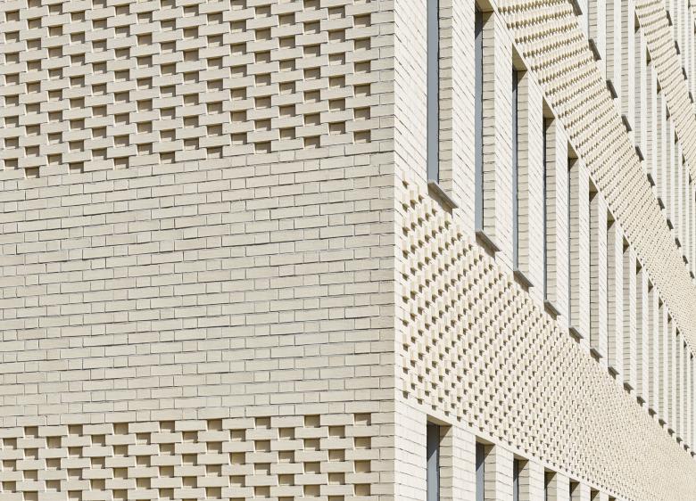 Die Anordnung der fein differenzierten Ziegeltexturen in Bändern, die an den Gebäudecken in der Höhenlage verspringen, sorgt für ein charakteristisch flächiges und abstraktes Erscheinungsbild Gebäudes und stellt ein wichtiges Gestaltungsmerkmal für den Baukörper mit seinen großen Flächen dar. So wird mit zeitgenössischen Mitteln auf den großen Detailreichtum der historischen Nachbarfassaden Bezug genommen.