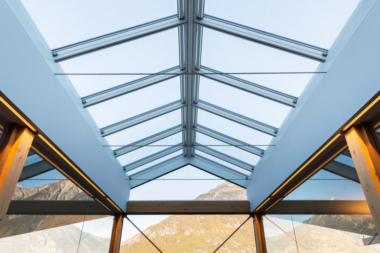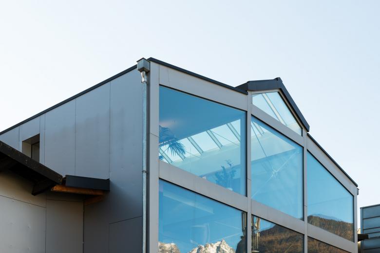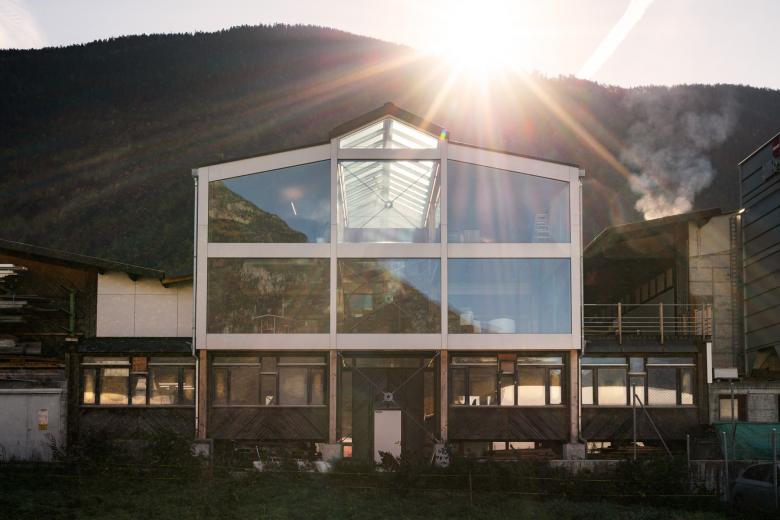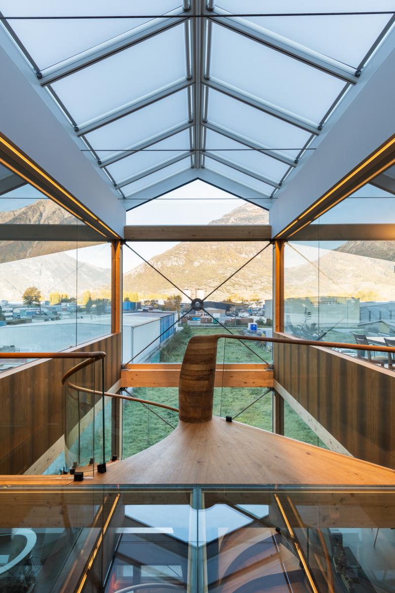 Eskiss ist ein innovatives Unternehmen für Schreinerei, Möbeltischlerei und Innenarchitektur. Der Unternehmenssitz im Wallis wurde in Eigenregie grundlegend saniert und ein administrativer Zwischenbau um zwei Geschosse aufgestockt. Entsprechend des Unternehmensmottos "individuellen Lebensraum" zu schaffen wurde dabei besonderer Wert auf eine Verbindung von qualitativ hochwertiger Handwerkskunst und baulich-technisch höchsten Standards gesetzt. Es entstand eine Holz-Glas-Sonderfassadenkonstruktion, die von einer Lichtlaterne aus VELUX Modular Skylights Sattel-Lichtbändern gekrönt wird. Innenliegende Zugbänder geben der filigranen Dachkonstruktion Stabilität. Den Mittelpunkt des Gebäudes bildet eine organisch geformte Holzwendeltreppe, welche in der leichten Holz-Glasarchitektur zu schweben scheint.