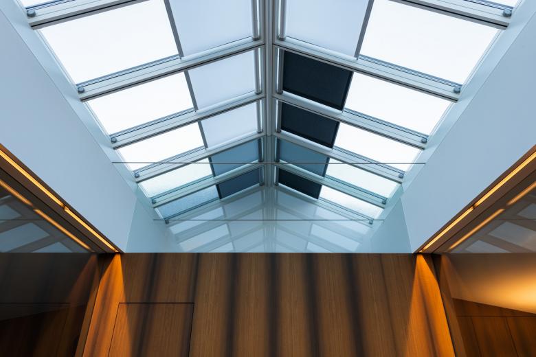 Aus energetischen und konzeptionellen Gründen sollte die Tageslichtversorgung in den Räumlichkeiten maßgeblich über die Fassadenverglasungen sowie die VELUX Modular Skylights gewährleistet sein. Dazu wurden 12 Sattel-Lichtband Module, darunter vier zu öffnende Module mit innenliegendem individuell steuerbarem Sonnenschutz montiert – die Montage wurde ebenfalls von dem Unternehmen Eskiss selbst durchgeführt. Nun können der Licht- und Wärmeeintrag sowie das Raumklima durch die Lüftungsmodule nach Bedarf reguliert werden. Glastrennwände im Gebäudeinneren sorgen dafür, dass das Tageslicht möglichst tief in die Verwaltungsräume und den Showroom fallen kann.
