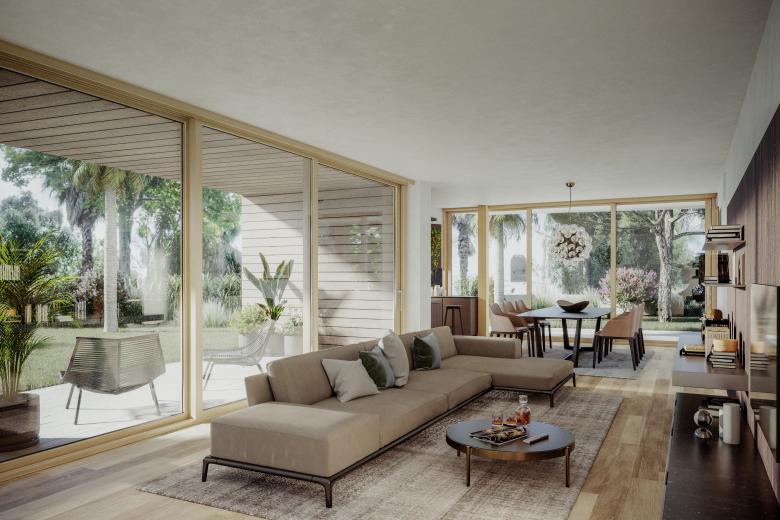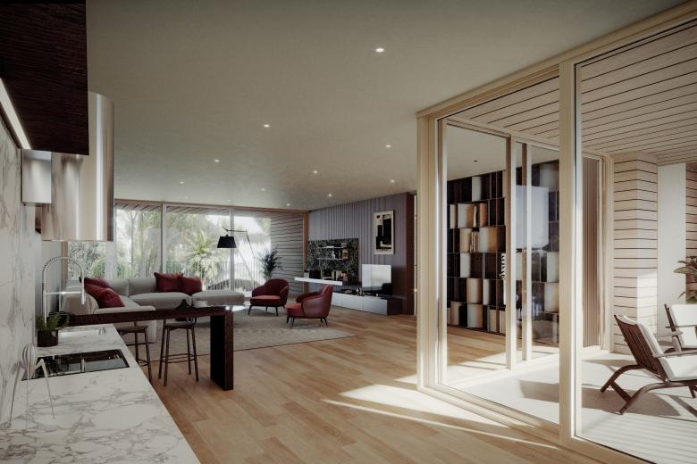 The apartments have east-west facing living areas, while the sleeping areas are mainly north-facing. One of the building’s specific features is that all the flats face the loggias, so that there are no windows or doors on the façade and the architecture can be modulated as if it were a hollowed-out volume.